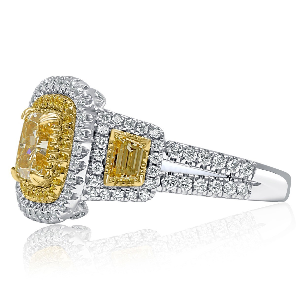 Elegant diamond engagement ring features a 1.00 carat GIA certified cushion modified brilliant light yellow (Y to Z Range) natural diamond embraced by two trapezoid step cut faint yellow side diamonds. The center diamond is surrounded by a double halo frame with colorless and yellow round cut diamond accents. Additional diamonds line the shank and the gallery completing the brilliant appearance of this ring. Handcrafted in 18k multi tone gold and finished with high polish. The total carat weight is 2.18 carats. Our products are all hand made with quality and care, in the heart of the diamond district on 47th Street in New York City. Our dedication and commitment to fine work and quality exceeds all others. Since all of our products are handmade in the USA, every piece shares the same level