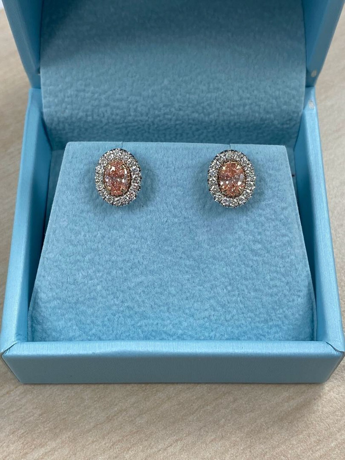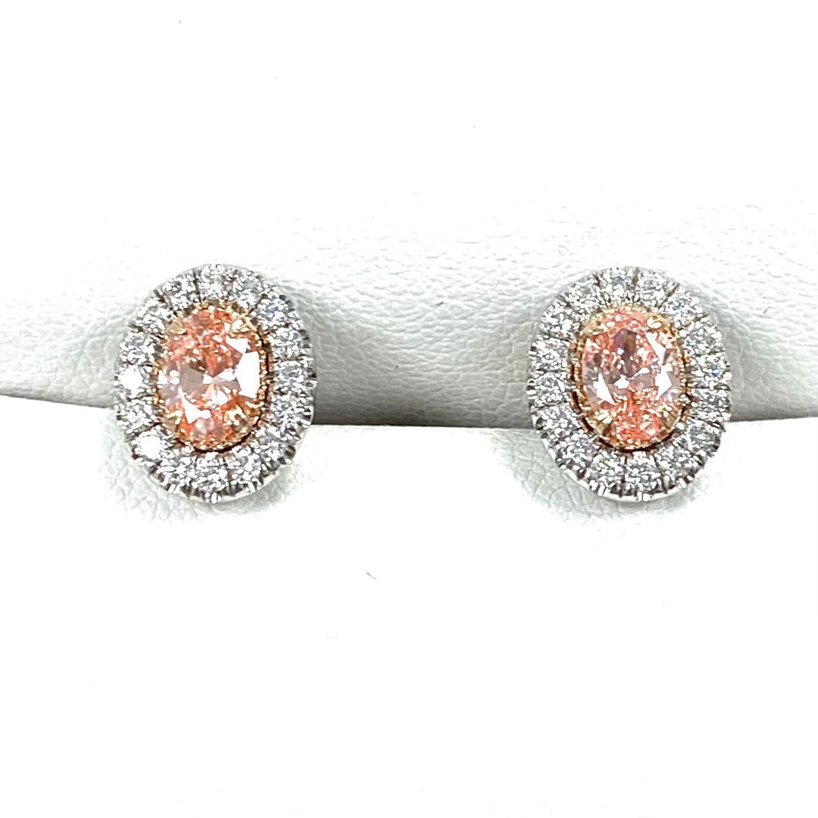 These a amazing pair earrings feature 0.72 carat oval brilliant cut pink lab grown diamond center stones surrounded by of colorless round brilliant cut diamonds in micro pave setting. The combination of these shapes adds a sophisticated Sparkle and complements the center stone beautifully. Handcrafted in 14k white gold and secure with screw back closure. The total carat weight is 1.20 carats.