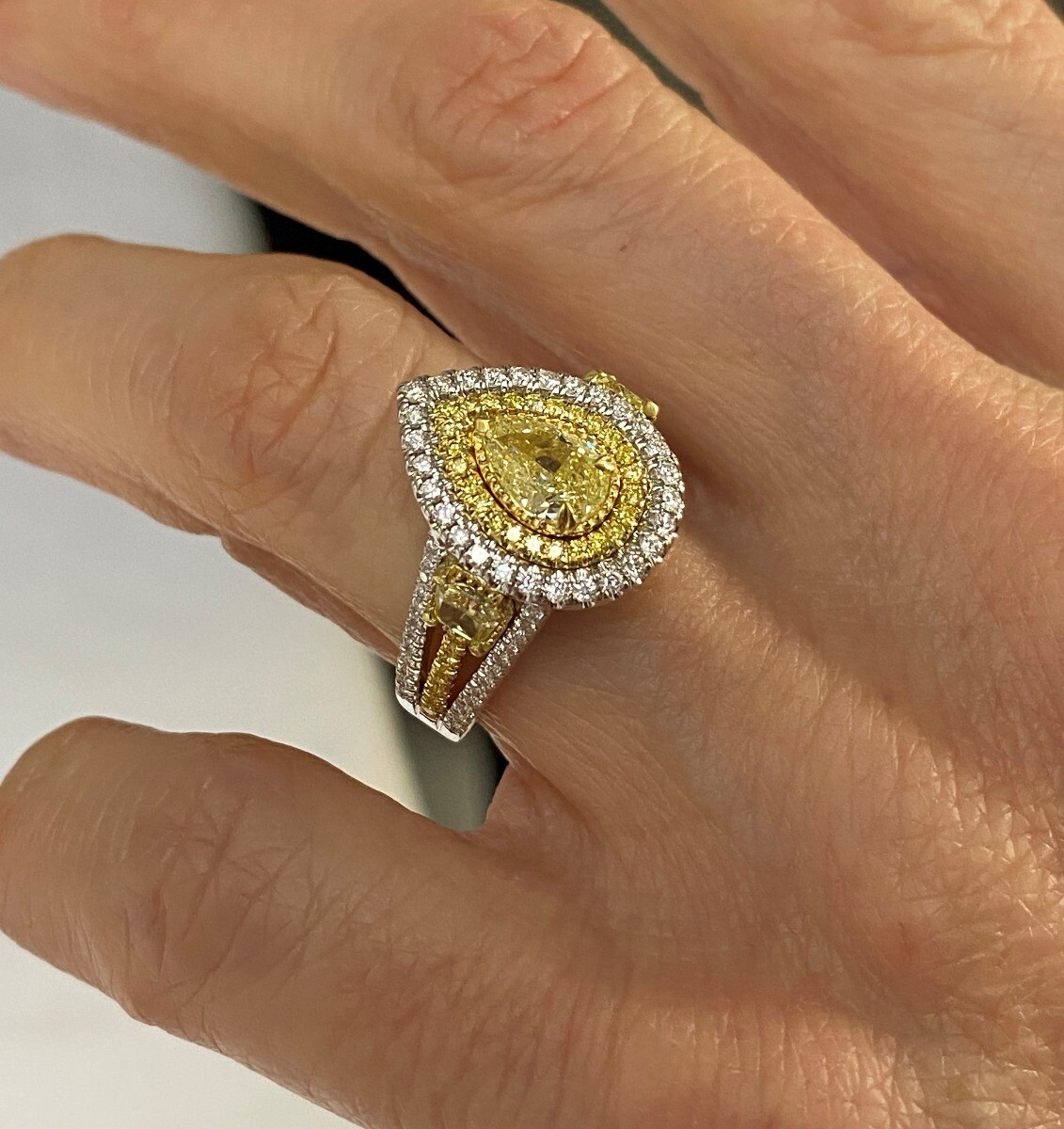 Exquisite Art Deco Design Diamond Ring verfügt über einen atemberaubenden 0,78 Karat GIA -zertifizierten, birnenformigen natürlichen, hellgelben Diamantzentrum, der von einem doppelten Halo aus gelben und farblosen runden geschnittenen Diamanten umgeben ist. Der geteilte Schaft mit zwei natürlichen schicken hellgelben Trapez -geformten Diamanten -Seiten vervollstandigen ein Design und verleihen diesem Ring eine zusatzliche Eleganz. Handgefertigt in 18 Karat Multi-Tone-Gold. Der Ring wird mit dem Gemological Institute of America Certificate (GIA) # 2223453573 geliefert
