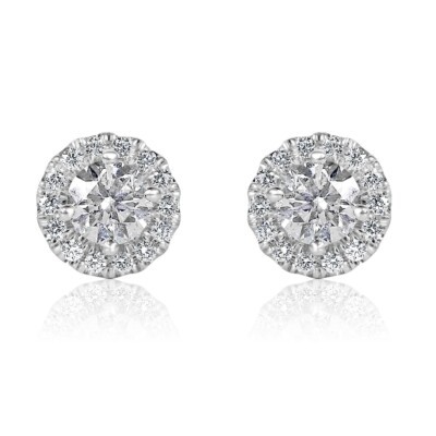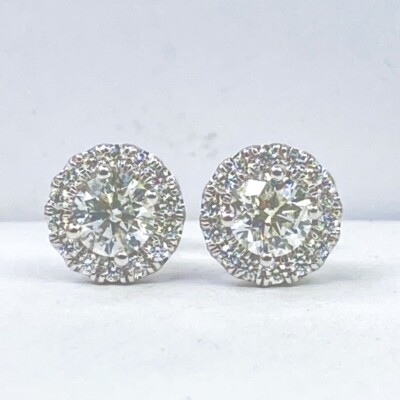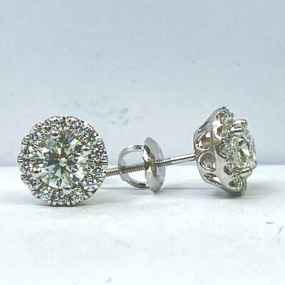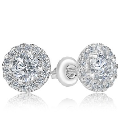 ¡Este encantador pendientes de sementales agregara magia al momento especial! Estos pendientes cuentan con piedras centrales de diamantes naturales de corte redondo de 1,01 quilates rodeados por un halo de diamantes de corte redondo incoloro en la configuracion de micro pavimento. Hecho a mano en oro blanco de 14k. El peso total de quilates es de 1.31 quilates. Los pendientes se aseguran con el cierre del tornillo.