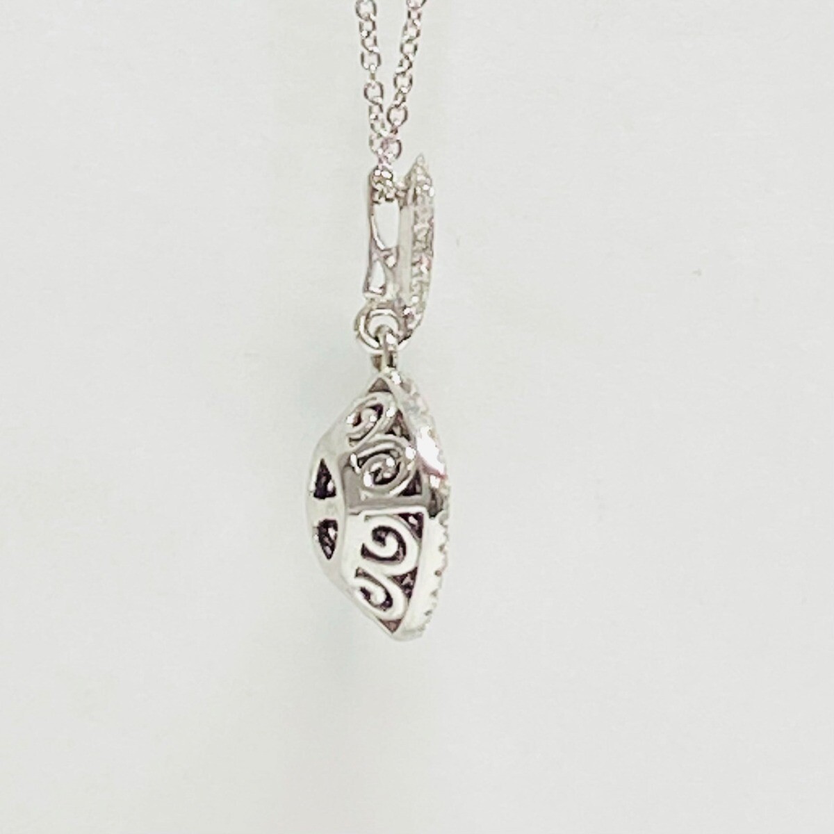 Este hermoso colgante cuenta con un centro de diamantes natural de corte redondo de 0.39 quilates rodeado por un halo doble de diamantes redondos incoloros de 0.33 quilates. Una forma de marquesa con diamantes incoloros de corte redondo sostiene el halo que agrega un sparkle adicional a este colgante. Hecho a mano de oro blanco de 14 quilates, este collar presenta una cadena Rolo de 16 "y un acabado pulido. El peso total de quilates es de 0,72 quilates.