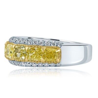 ¡Los diamantes de colchon tienen un atractivo inspirado en la antigua y son conocidos por sus bordes suaves y redondeados y facetas brillantes! Los diamantes amarillos, en particular, tienen un brillo calido y romantico que puede agregar un toque de personalidad a una alianza de bodas.