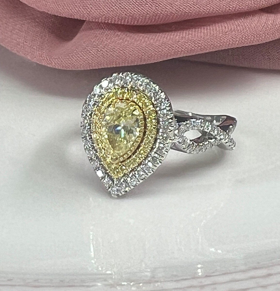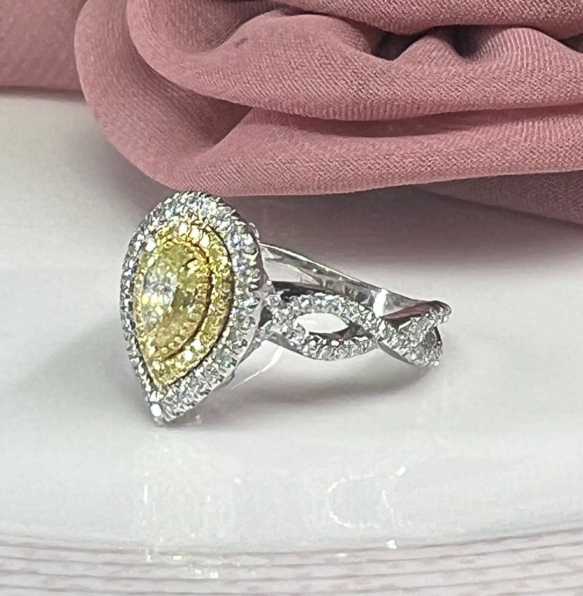 GIA Certificado 1.21 TCW Pera Luz Diamante Amarillo Compromiso Halo Anillo 18k