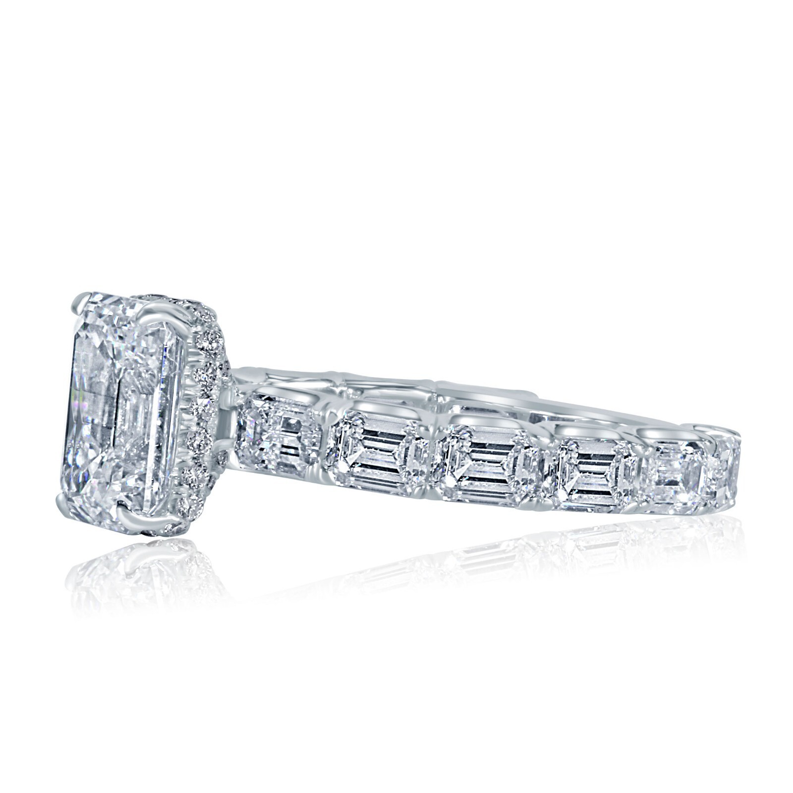 Este un anillo con un diamante de corte esmeralda cultivado en laboratorio que pesa 2.00 quilates, ubicado en oro blanco de 14k, con un peso total de quilates (TCW) de 4.60 quilates. Esto significa que el anillo adicional de corte redondo mas pequeño con 2.32 quilates mas pequeños de diamantes de laboratorio de corte esmeralda con un total de 2,60 quilates ademas del diamante de corte esmeralda cultivado en laboratorio de 2.00 quilates.