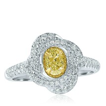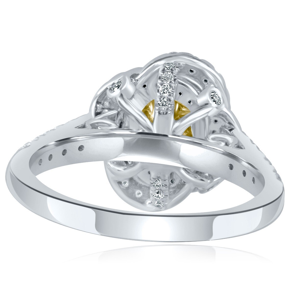 Ceci est un anneau de diamant unique symbolisera l'eternite avec votre partenaire! Cette bague de fiancailles a ete centree avec un elegant diamant de coupe ovale jaune de fantaisie de 0,50 carat encercle avec un halo de diamants incolores pour une brillance supplementaire. Fabrique a la main en or deux karats a deux tons. Le poids total des carats est de 1,06 carats.