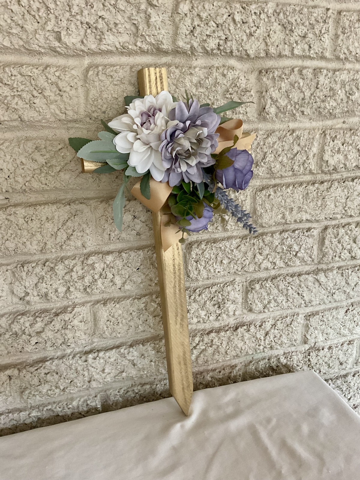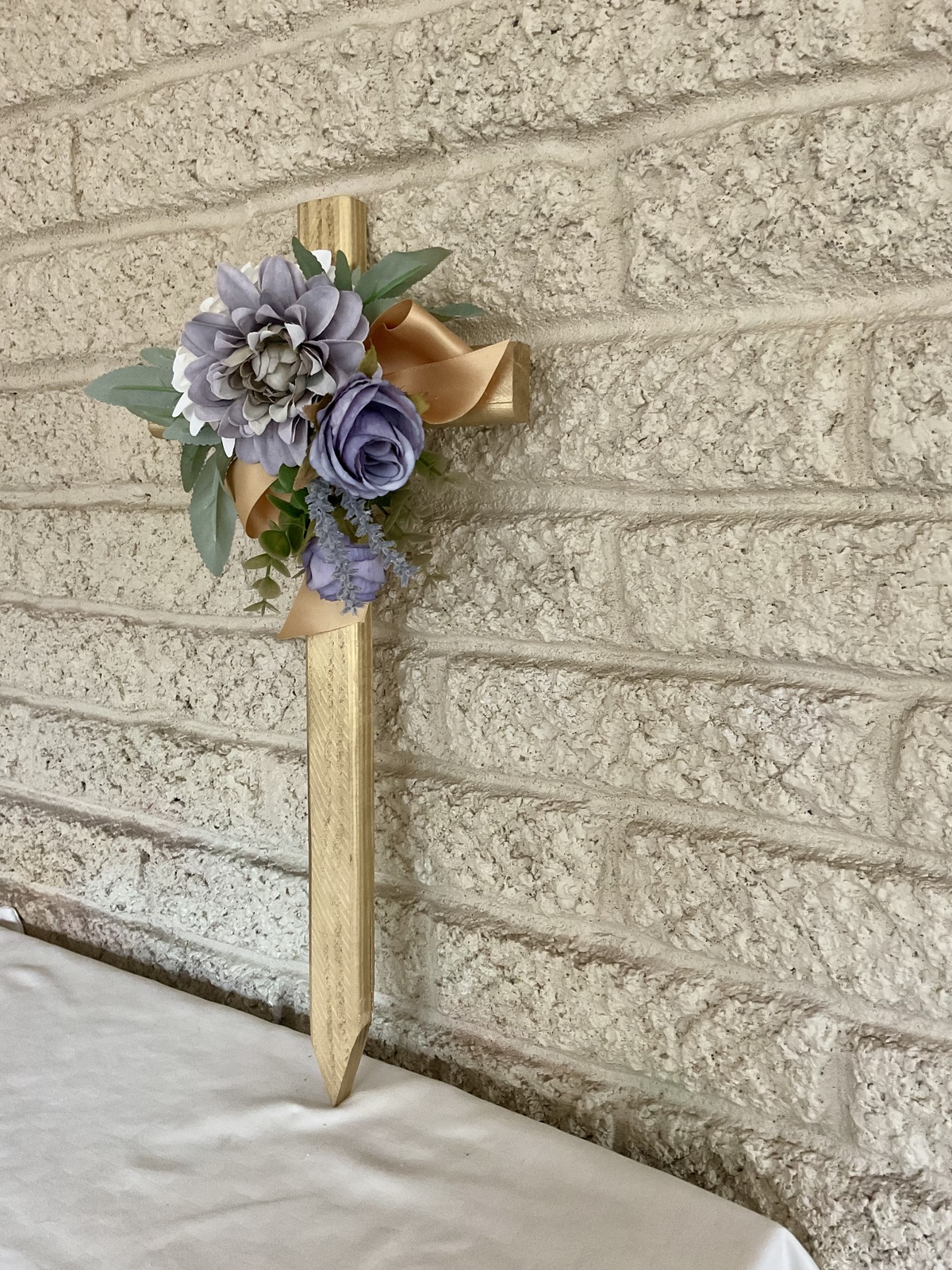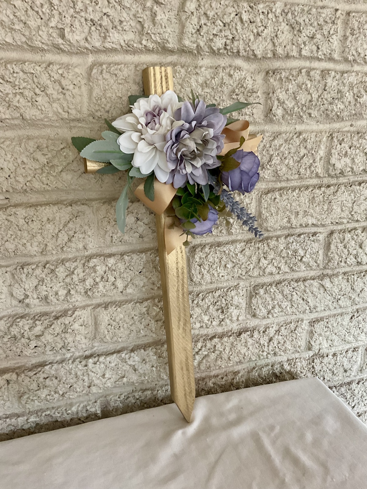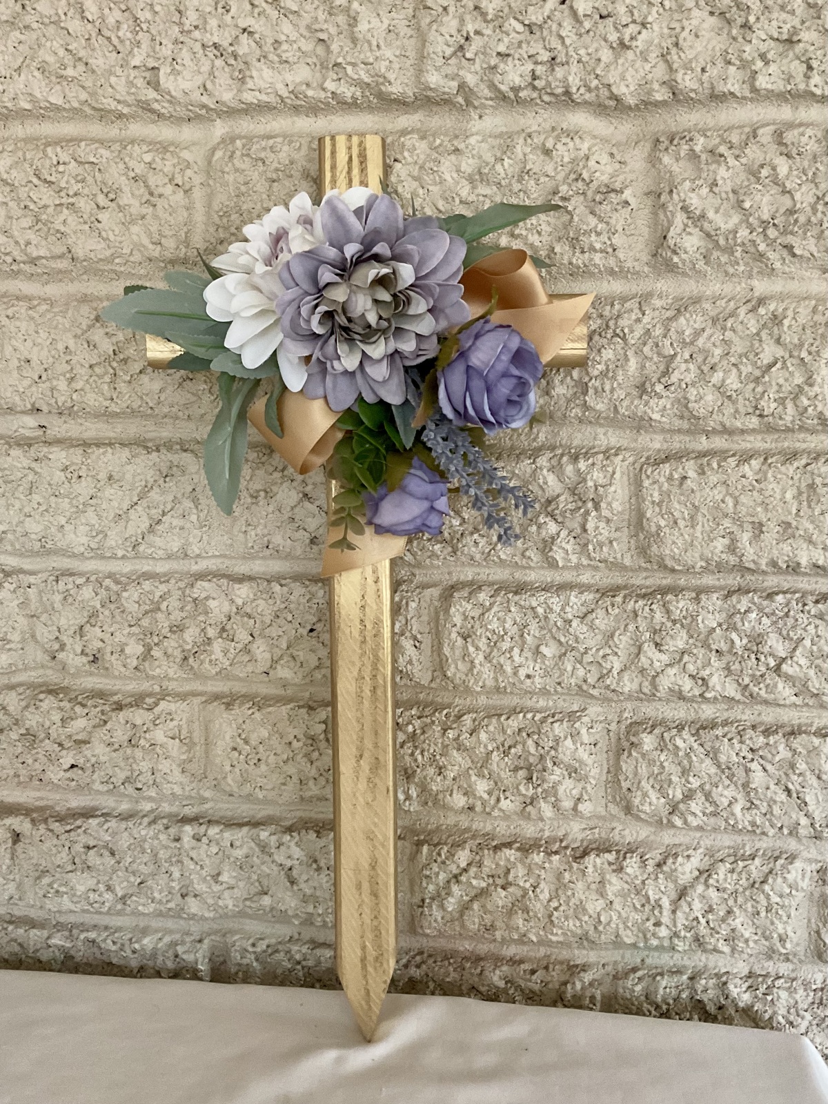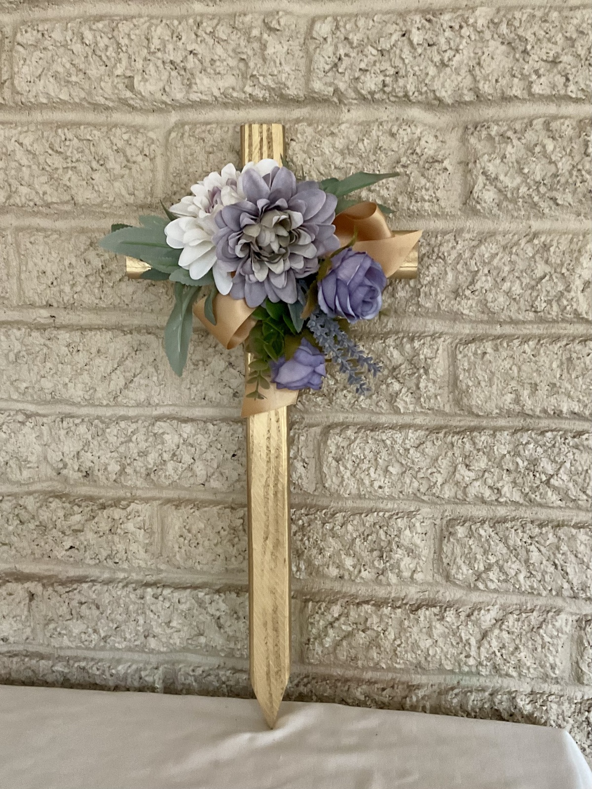 Enhance the beauty of your loved one's resting place with this 18” pine cemetery cross. Expertly hand-painted gold and adorned with small periwinkle roses, mums in periwinkle and white, layers of various greenery, and gold satin ribbon. A heartfelt tribute that radiates peace and love. The cross has a pointed end for easy ground insertion. Every cross is sprayed with a coat of clear polyurethane to protect the ribbon and silk flowers from outdoor elements.