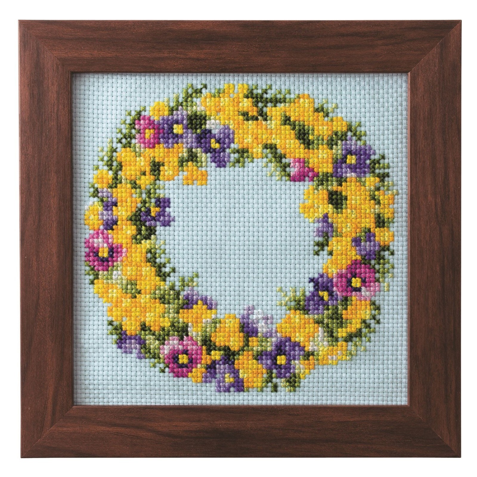 Cosmo Mimosa Wreath Seasonal Flower Arrangement Cross Stitch Kit. This cross stitch kit comes with everything you need to make the beautiful seasonal floral project. March: Mimosa Wreath. Kit Includes: COSMO Embroidery Floss (100 percent cotton), 1m each, COSMO Embroidery Cloth (100 percent cotton), Embroidery Needle, Square Wooden Frame 6.75 inches x 6.75 inches, Instruction Manual with Design Chart. Frame Size: Approximately 6-3/4 inches x 6-3/4 inches. Difficulty Level: Intermediate. No. 592303. CHK-592303