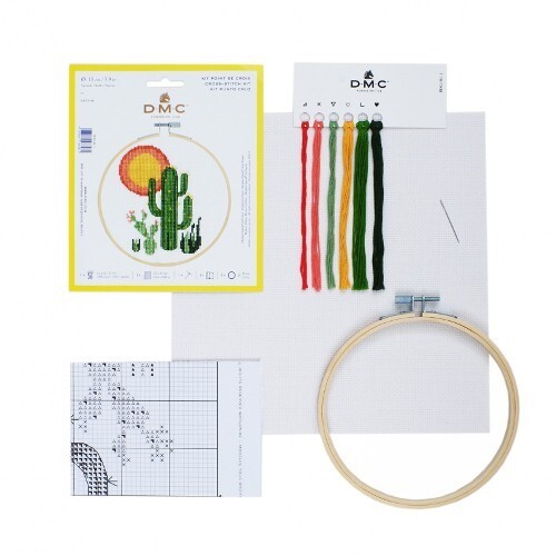 DMC Beginners Cross Stitch Kit XS Cactus BK1911L. A beginner?s dream, this little kit brings BIG value. The DMC Stitch Kit Collection provides all you need to make this inspired design your own. Kit Includes Everything You Need: 9.8in x 9.8in (25 x 25 cm) 14 Count - 100 Percent Cotton, Aida Cloth, 6in. Bamboo Hoop, DMC Embroidery Floss, Tapestry Needle, and Complete Instructions. Design features: Several Cacti featuring a hot sun in the background. Finished Size: 9.8 inches x 9.8 inches. CHK-BK1911L