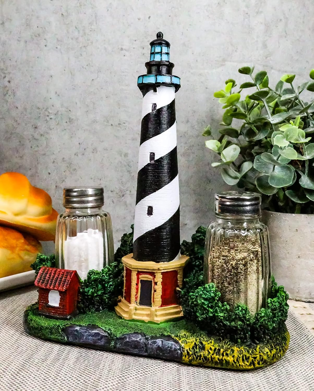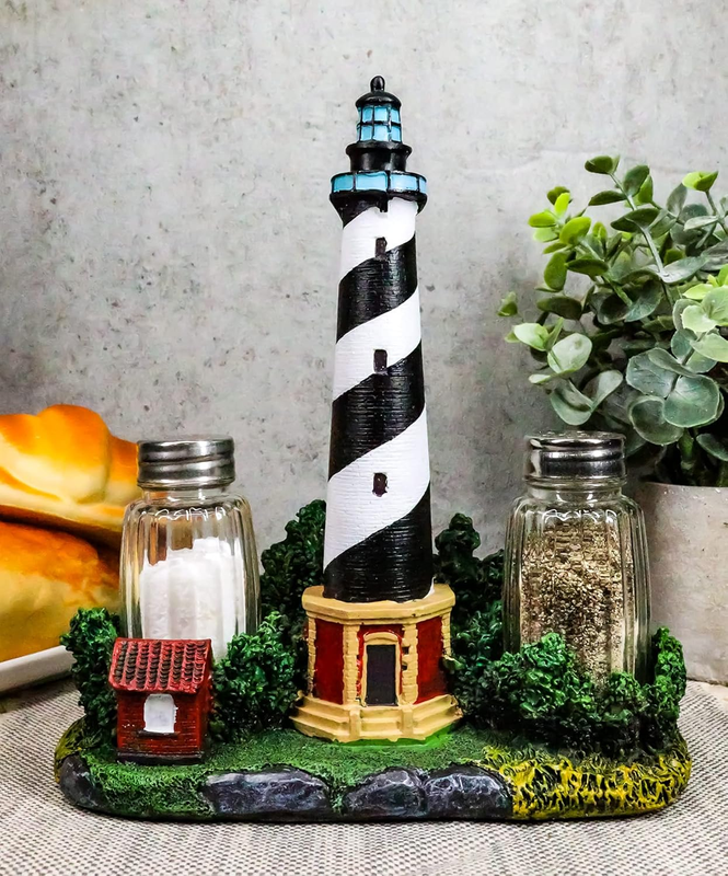 This Lighthouse Salt Pepper Shakers Holder Figurine measures 8" tall, 6.75" long and 3" deep approximately. This Lighthouse Salt Pepper Shakers Holder is made of polyresin, hand painted and polished individually. Color Tone may vary from pictures. This Lighthouse figurine is a great addition to any kitchen setup featuring a world renowned Cape Hatteras Lighthouse with two glass shakers at the feet of it. Set it on your dining table, kitchen countertop or what have you!