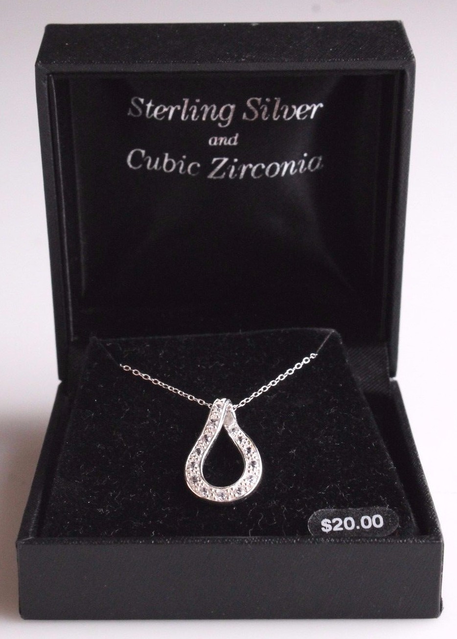 This is for a brand new 18" Sterling Silver Twist Oval Open with Cubic Zirconia Trimmed Pendant Necklace Sterling Silver twisted oval open circle pendant with sparkling cubic zirconia stones on 18 chain with spring ring clasp. A great fashionable and elegant gift idea. Perfect gift for that special someone for any occasion. Comes packaged in a gift box. Necklace Length 16" with 2" extender Circle Pendant measures approximately 0.75" x 0.5"