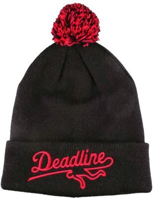 The Deadline SPORTS Logo Beanie Cap features a folded cuff with logo embroidery and top pom