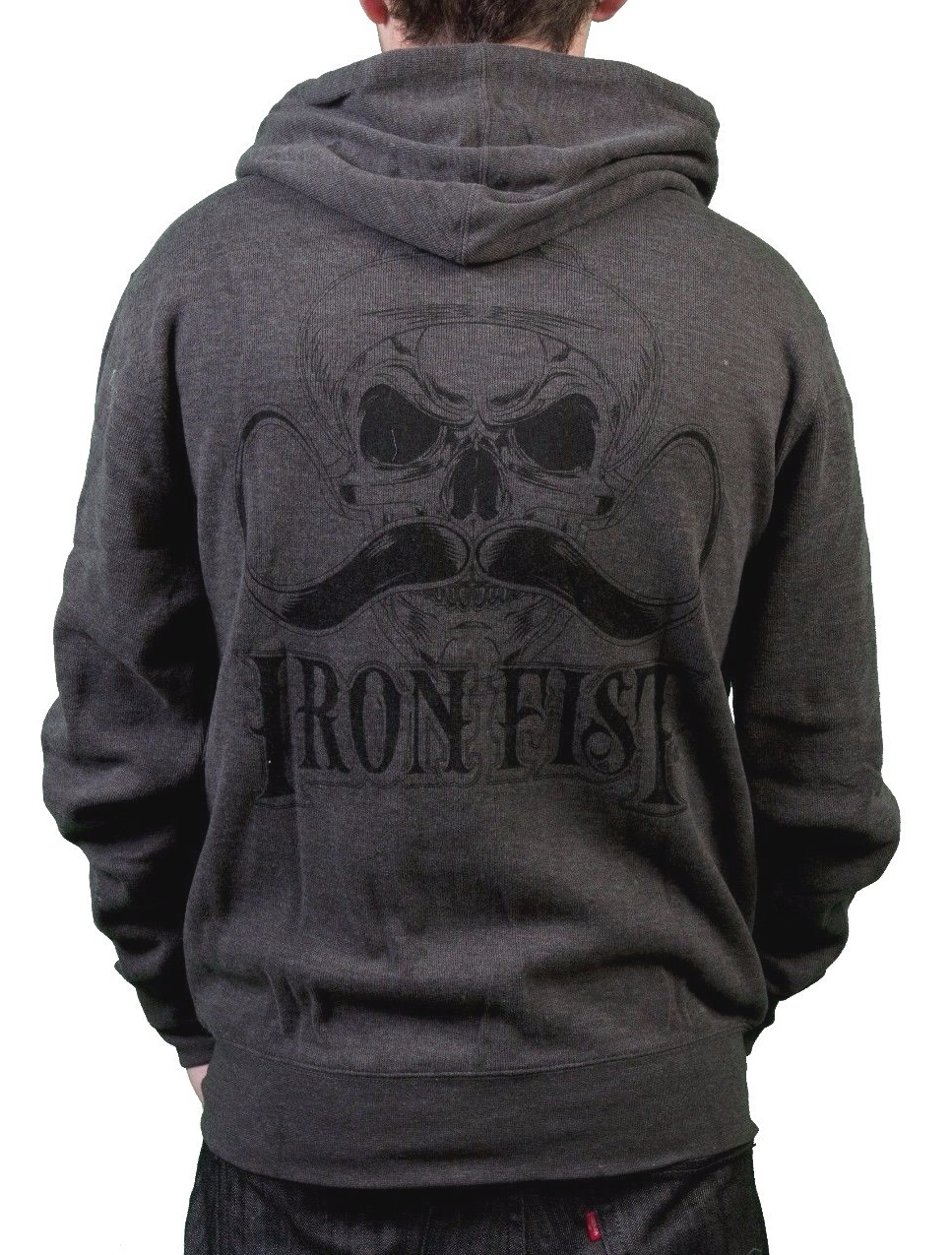 This is for a brand new with tags Iron Fist Mens Melcher French Rib Burnt Charcoal Hoodie The back has a graphic print of a skull with a very large moustache.