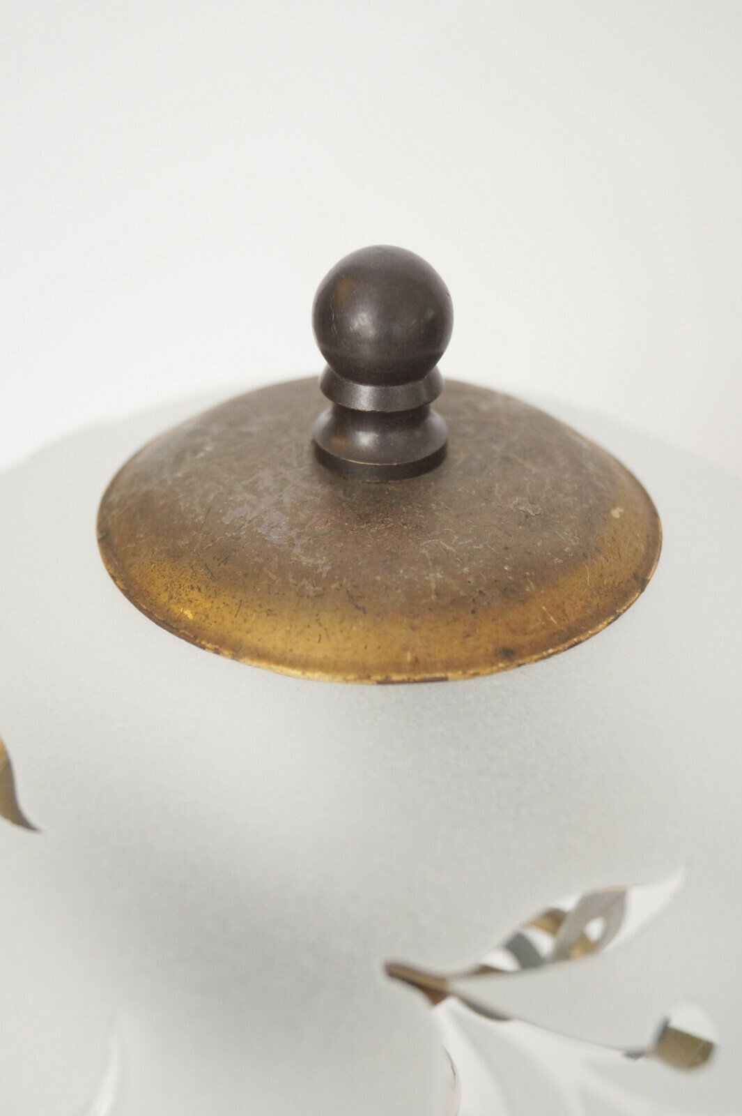 Important: We recommend only using LED bulbs (filament bulbs!) for each of our lights. In addition to the up to 12 times higher efficiency, the very low heat generation of an LED bulb ensures the lifespan of the electrics and the valuable original glass of your light. LED bulbs available everywhere or here . Please also note: This is a used and/or antique item that, despite being refurbished and cleaned, shows clear signs of age and wear. If you are looking for a "new" and high-gloss hardware store style light, you have definitely come to the wrong place! Thank you for your understanding. Our lamps are all unique and stand out pleasantly from the always same look of the famous "brass lamps from the capital", where each lamp is ultimately available in thousands. You can only get indi