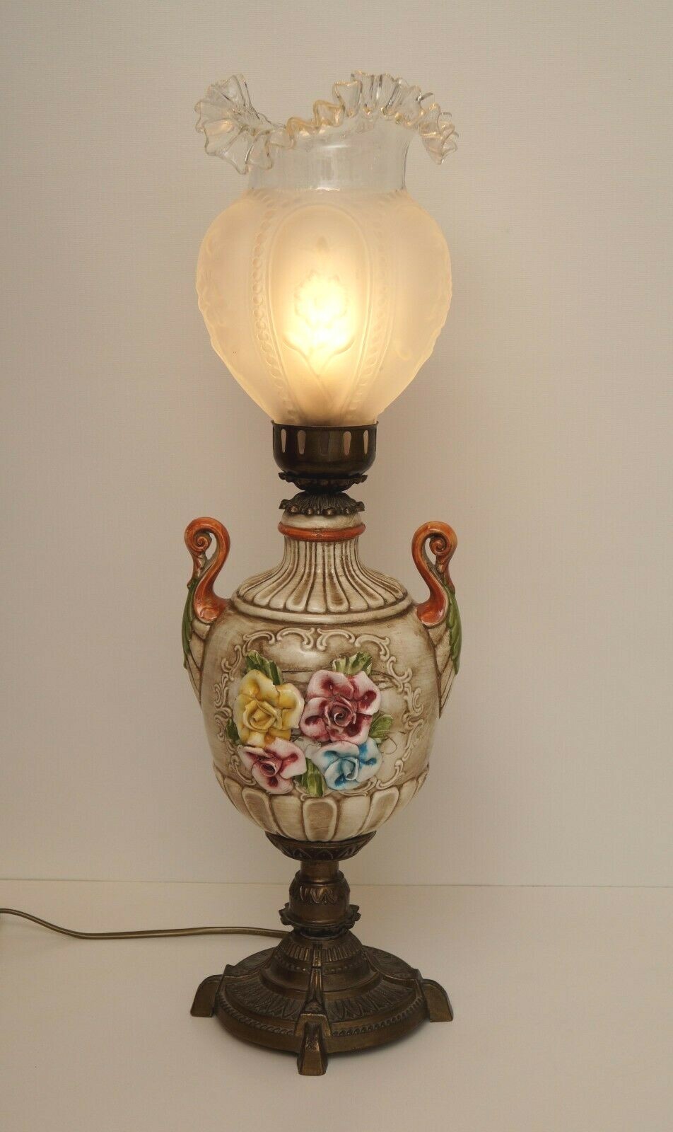 Dutch silent lamp in Art Nouveau. Ceramic gear with brass applications and magnificent flower/rose decor. Probably 1980s. Original glass with a subtle, barely perceptible flexor (see detailed photo). Total height approx. 62 cm, Shade diameter approx. 16cm. Brass-colored PVC supply line. Fully functional electrics, up to max. 60 watts. German E14 Standard version. Hundreds more Art Deco lights in our shop! Also suitable for LED/energy-saving bulbs with higher luminous efficiency. Small parts such as screws and washers replaced. Sale without decorations and lamps! Free shipping within Germany!