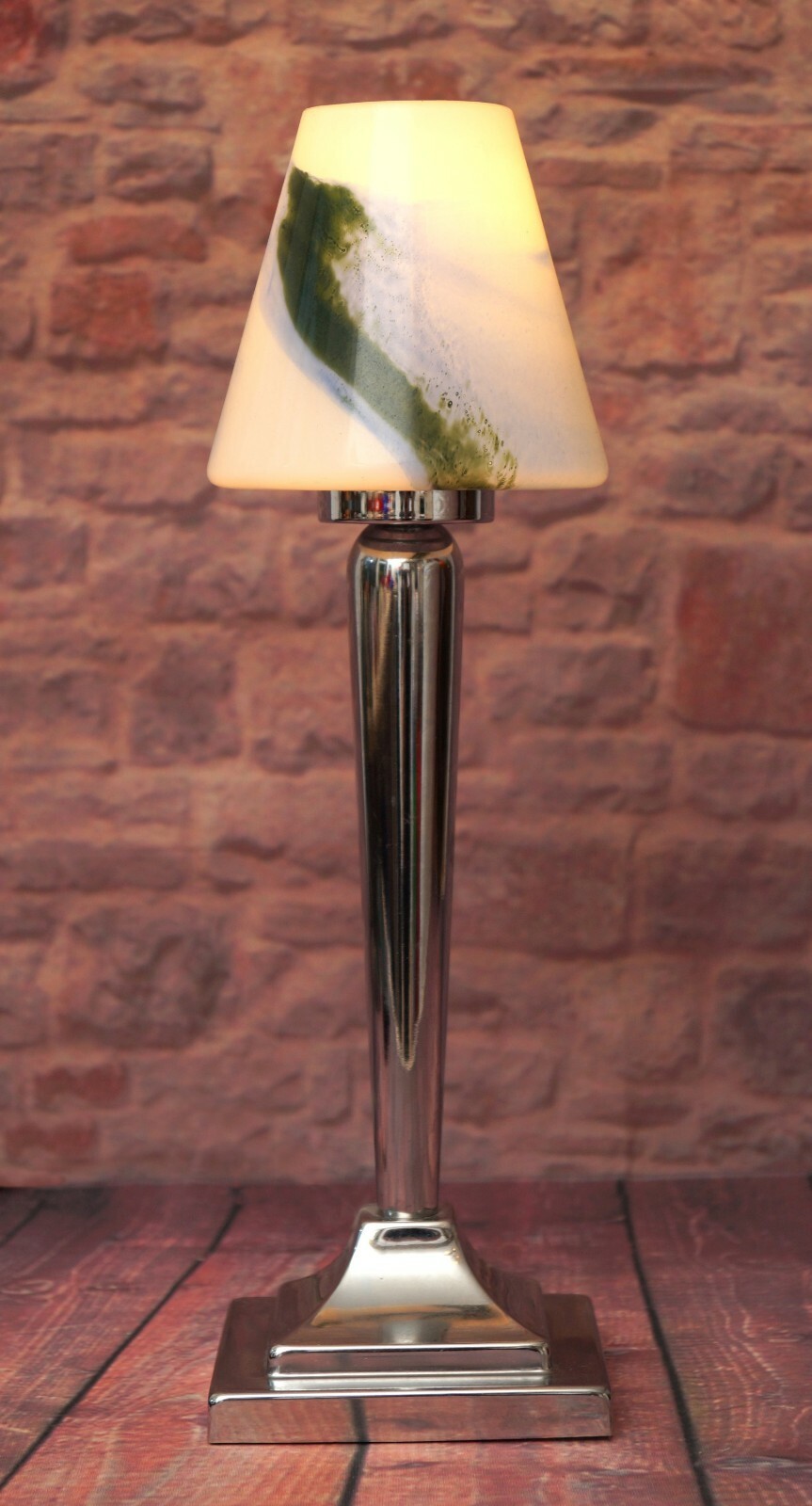 Elegant table lamp in Art Deco style, approx. 1980s. Chrome-plated steel gear with subtle signs of age and use. Opal glass shade with fantastic lighting effect. Total height approx. 37 cm, umbrella diameter approx. 9cm. Completely renewed electrical installation. PVC supply line with additional cord intermediate switch. E14 Standard version, up to max. 40 watts - we strongly recommend LED bulbs. Hundreds more Art Deco lights in our shop! Small parts such as screws and washers replaced. Please note: All of our lights were put into circulation well before 2005, are in their original condition and therefore do not fall under the Electrical and Electronic Equipment Act (EU WEEE Directive).