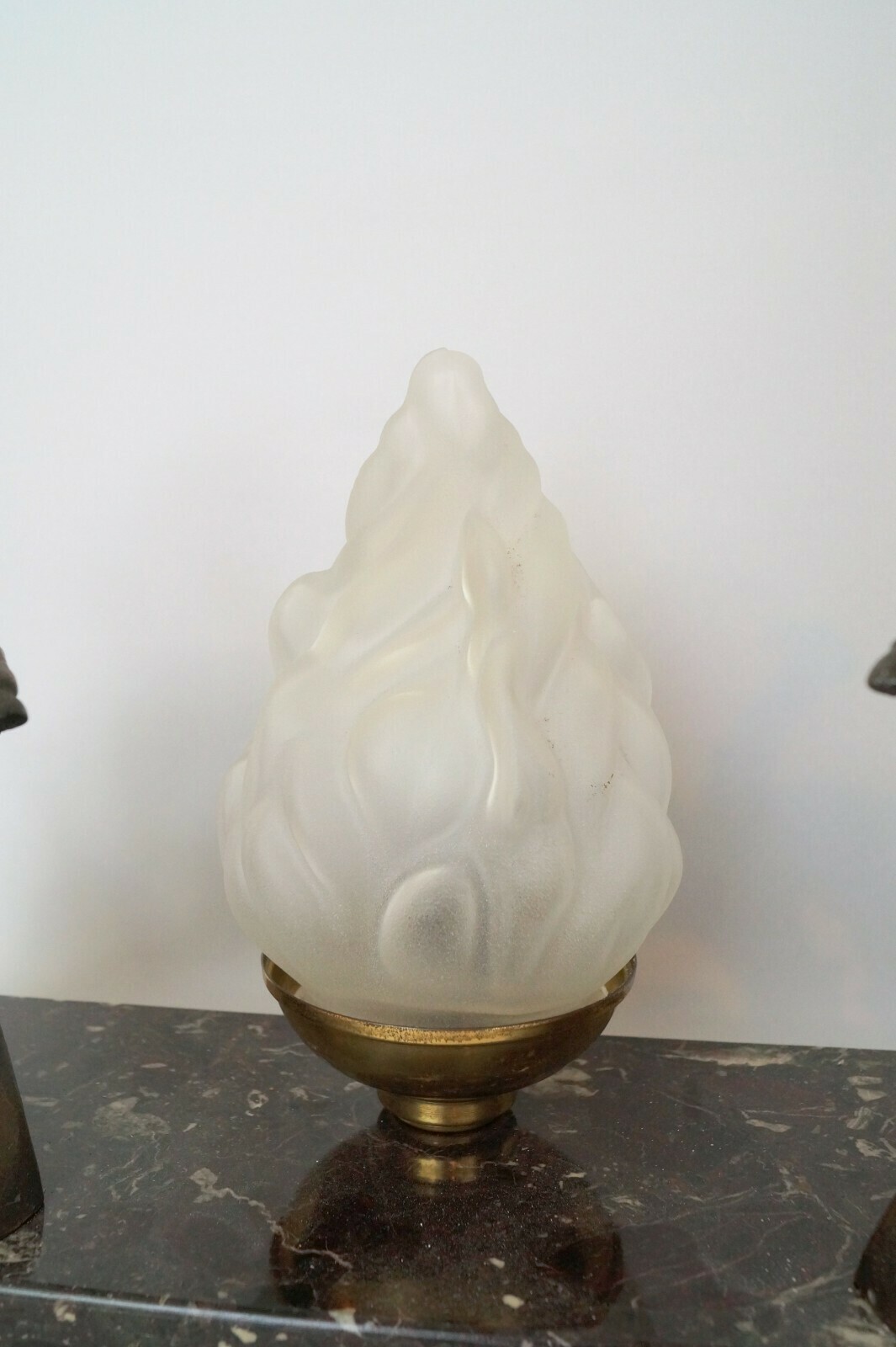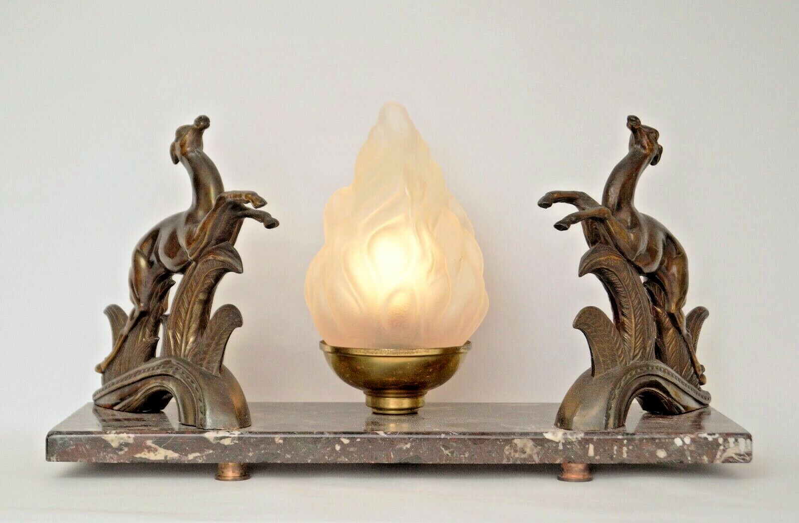 Beautiful original Art Deco table lamp. Around 1930. Subtle age and usage signs, beautiful patina. Probably brass or zinc cast. Total height approx. 22 cm, total width approx. 42cm. Completely new electrical installation. PVC supply cable with cord intermediate switch. French B 22 version, up to max. max. 40 watts - we strongly recommend LED bulbs. Hundreds more Art Deco lights in our shop! Small parts such as screws and washers replaced. Please note: All of our lights were put into circulation well before 2005, are in their original condition and therefore do not fall under the Electrical and Electronic Equipment Act (EU WEEE Directive).