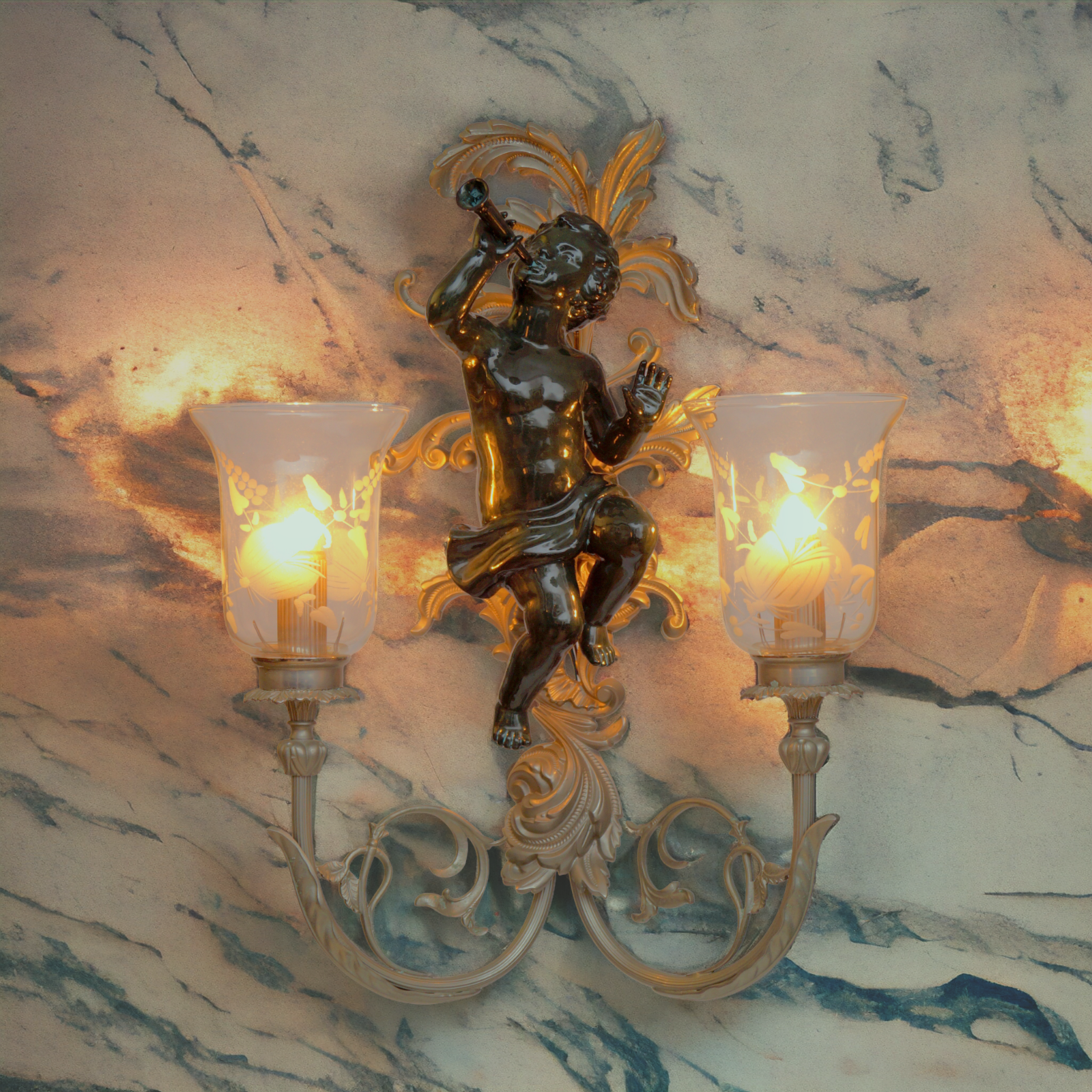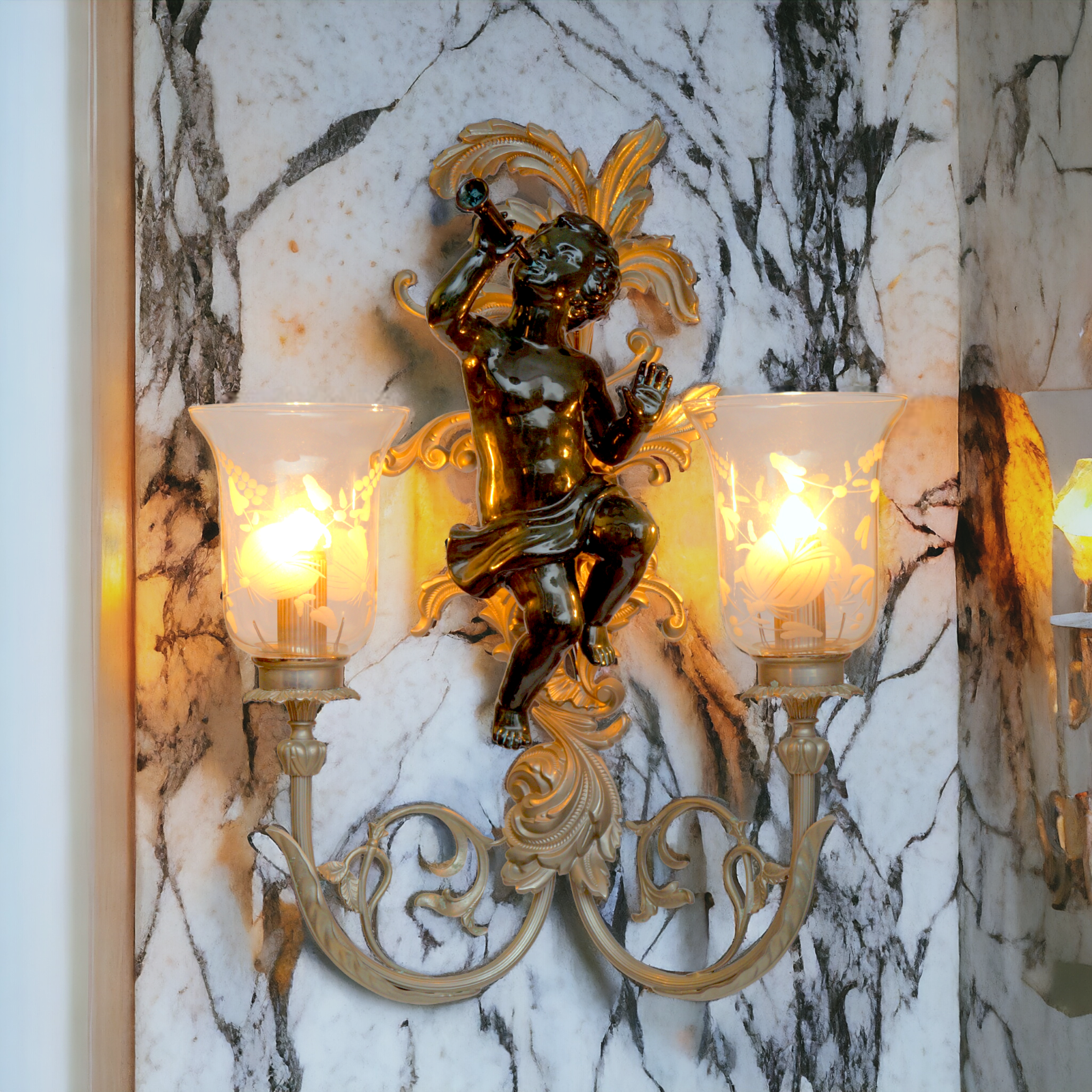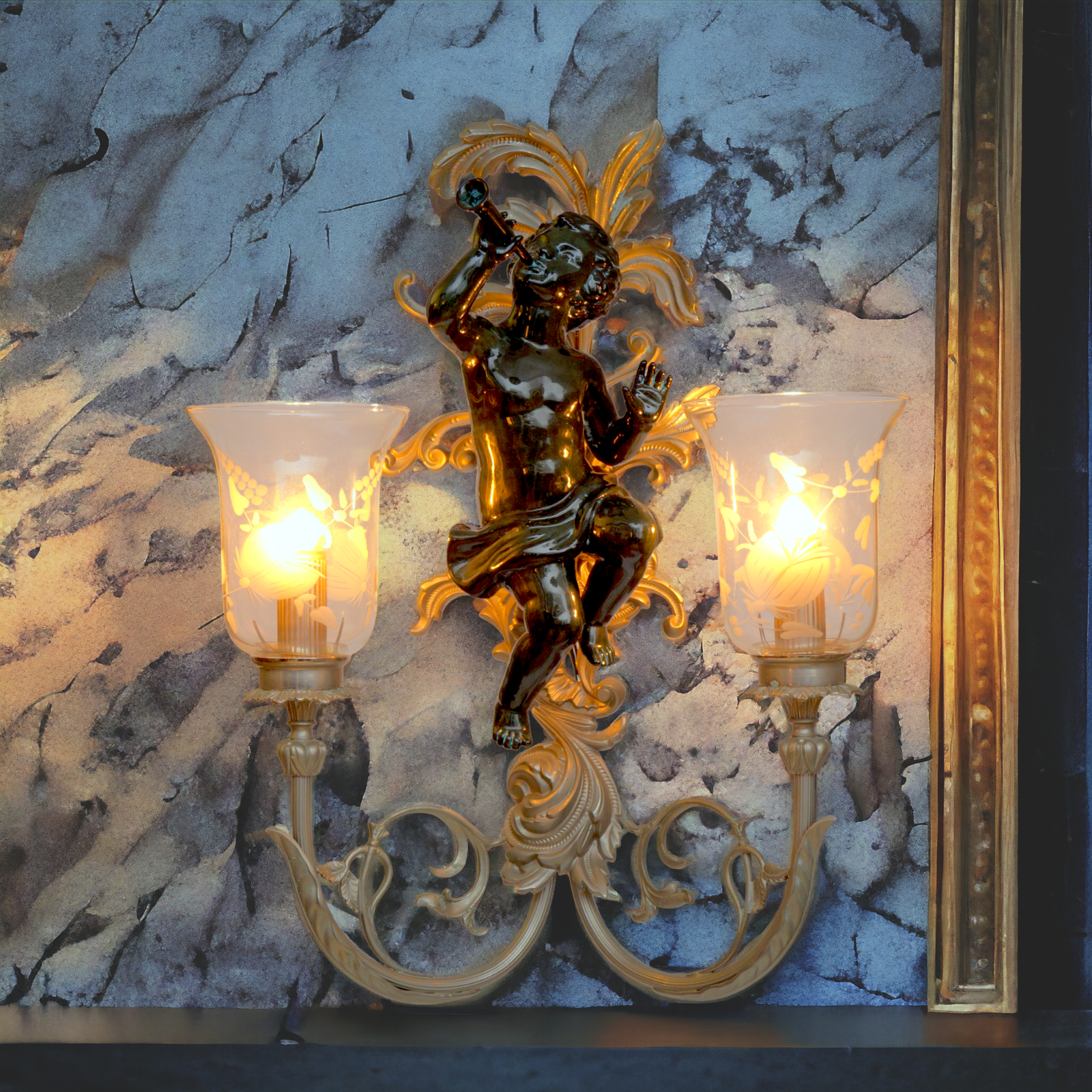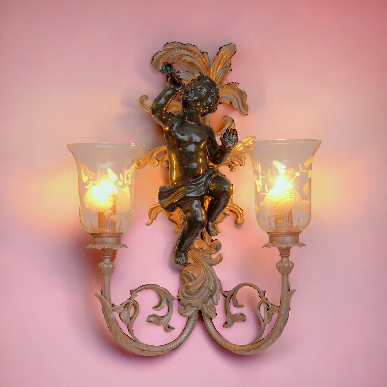 Extravagant Art Nouveau Wall Light "GREEN CHERUB" Putto Wall Lamp Angel
