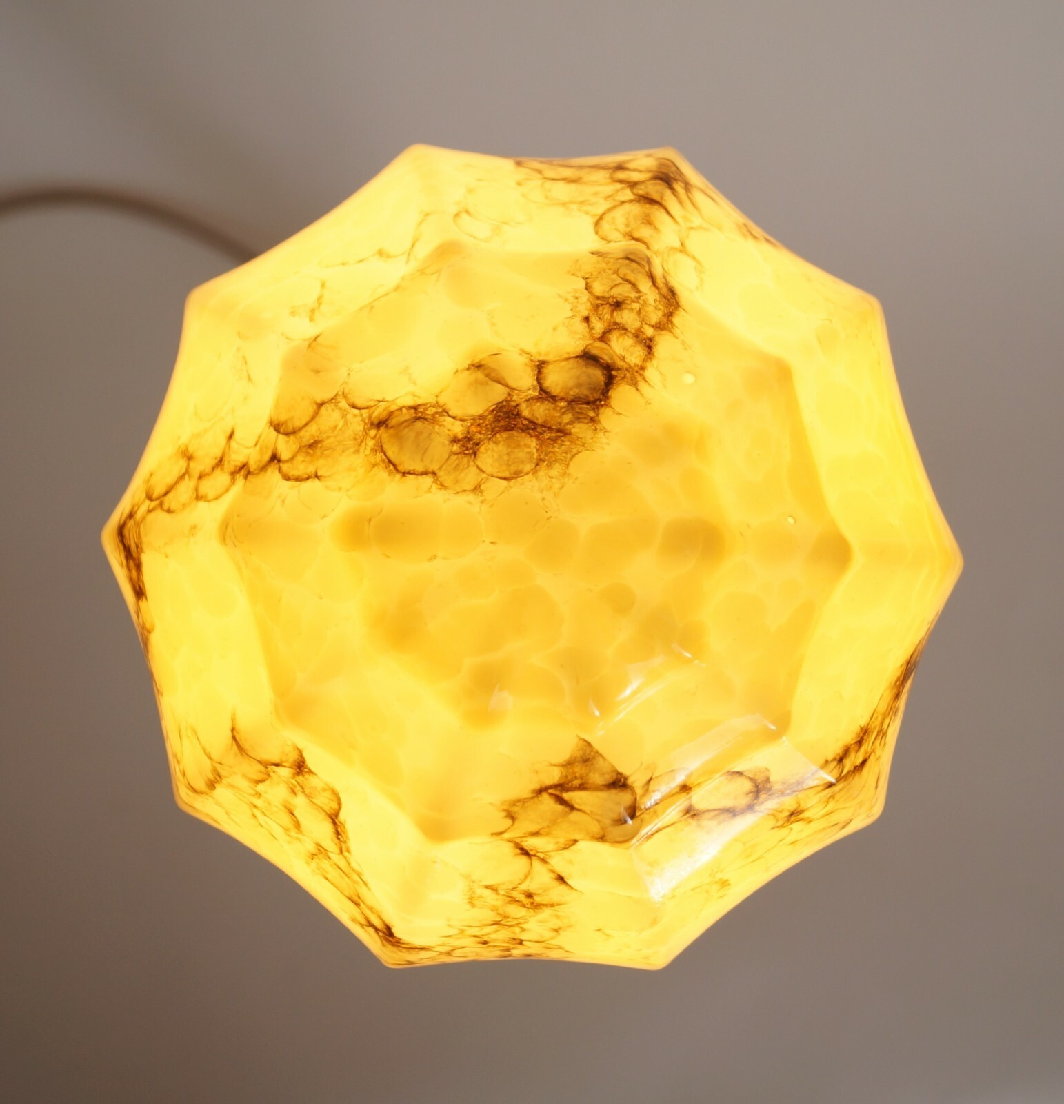 Important: We recommend only using LED bulbs (filament bulbs!) for each of our lights. In addition to the up to 12 times higher efficiency, the very low heat generation of an LED bulb ensures the lifespan of the electrics and the valuable original glass of your light. LED bulbs available everywhere or here . Please also note: This is a used and/or antique item that, despite being refurbished and cleaned, shows clear signs of age and wear. If you are looking for a "new" and high-gloss hardware store style light, you have definitely come to the wrong place! Thank you for your understanding. Our lamps are all unique and stand out pleasantly from the always same look of the famous "brass lamps from the capital", where each lamp is ultimately available in thousands. You can only get indi