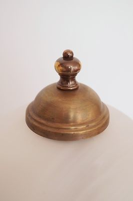 Guaranteed single piece from our lighting factory. Satin marbled glass shade, modern. Goldlack decor rubbed somewhat in places. Light for individualists! Unique, antiquity, bluish patinated brass gear. Shade diameter approx. 33cm.