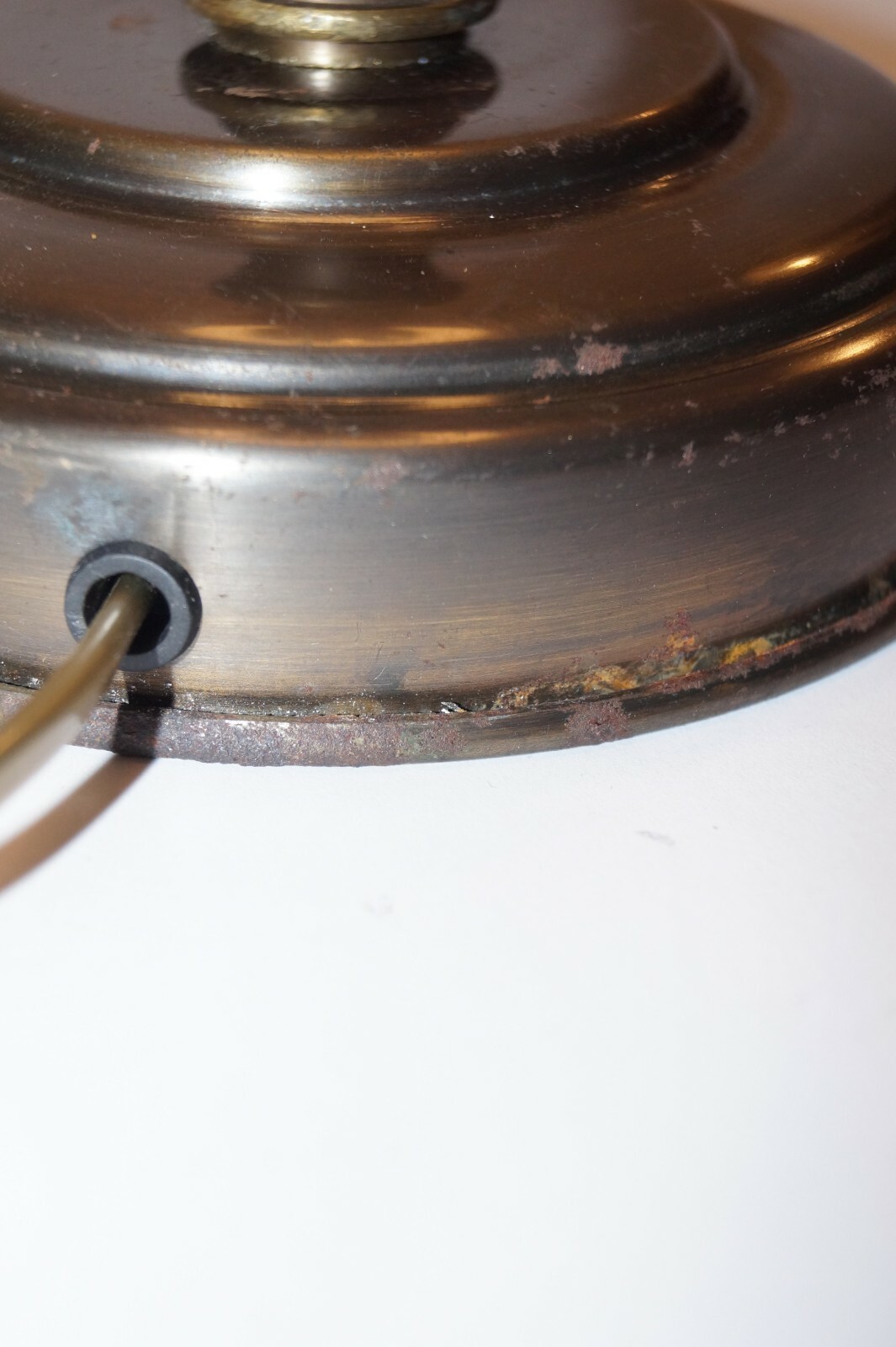 Important: We recommend only using LED bulbs (filament bulbs!) for each of our lights. In addition to the up to 12 times higher efficiency, the very low heat generation of an LED bulb ensures the lifespan of the electrics and the valuable original glass of your light. LED bulbs available everywhere or here . Please also note: This is a used and/or antique item that, despite being refurbished and cleaned, shows clear signs of age and wear. If you are looking for a "new" and high-gloss hardware store style light, you have definitely come to the wrong place! Thank you for your understanding. Our lamps are all unique and stand out pleasantly from the always same look of the famous "brass lamps from the capital", where each lamp is ultimately available in thousands. You can only get indi