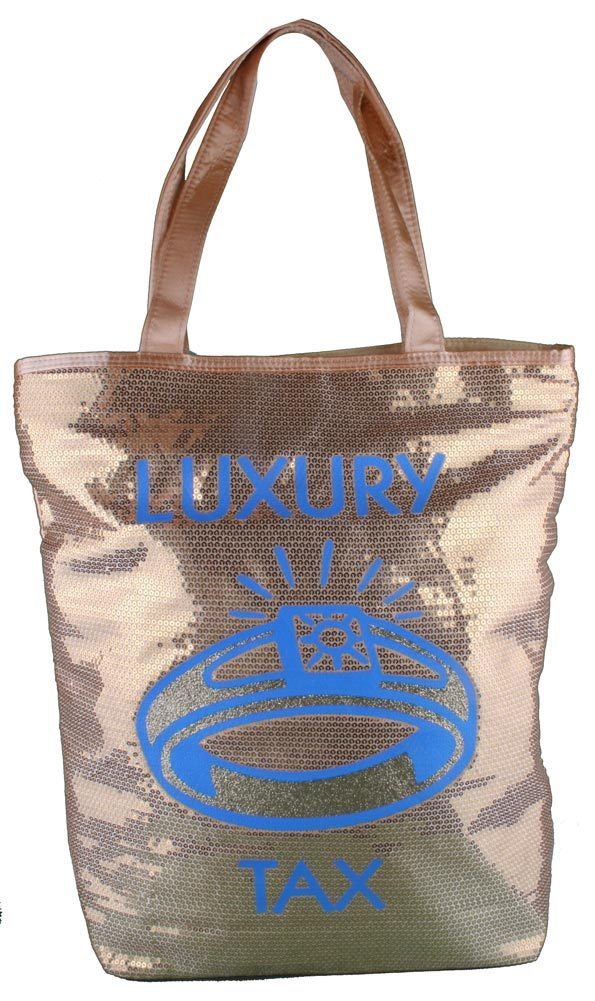 This Monopoly Luxury Tax Tote Bag features a image of a ring in Blue with Tax underneath it on top of gold sequins.
