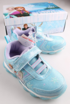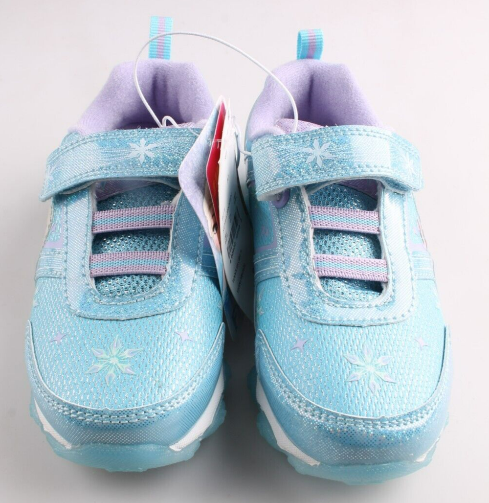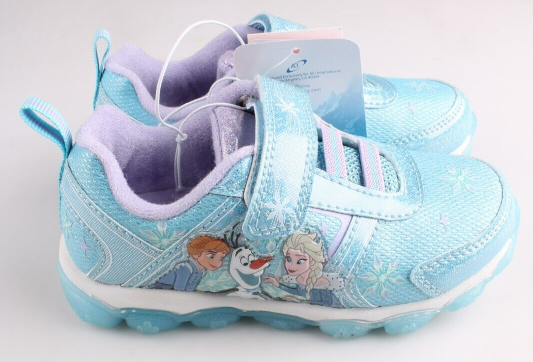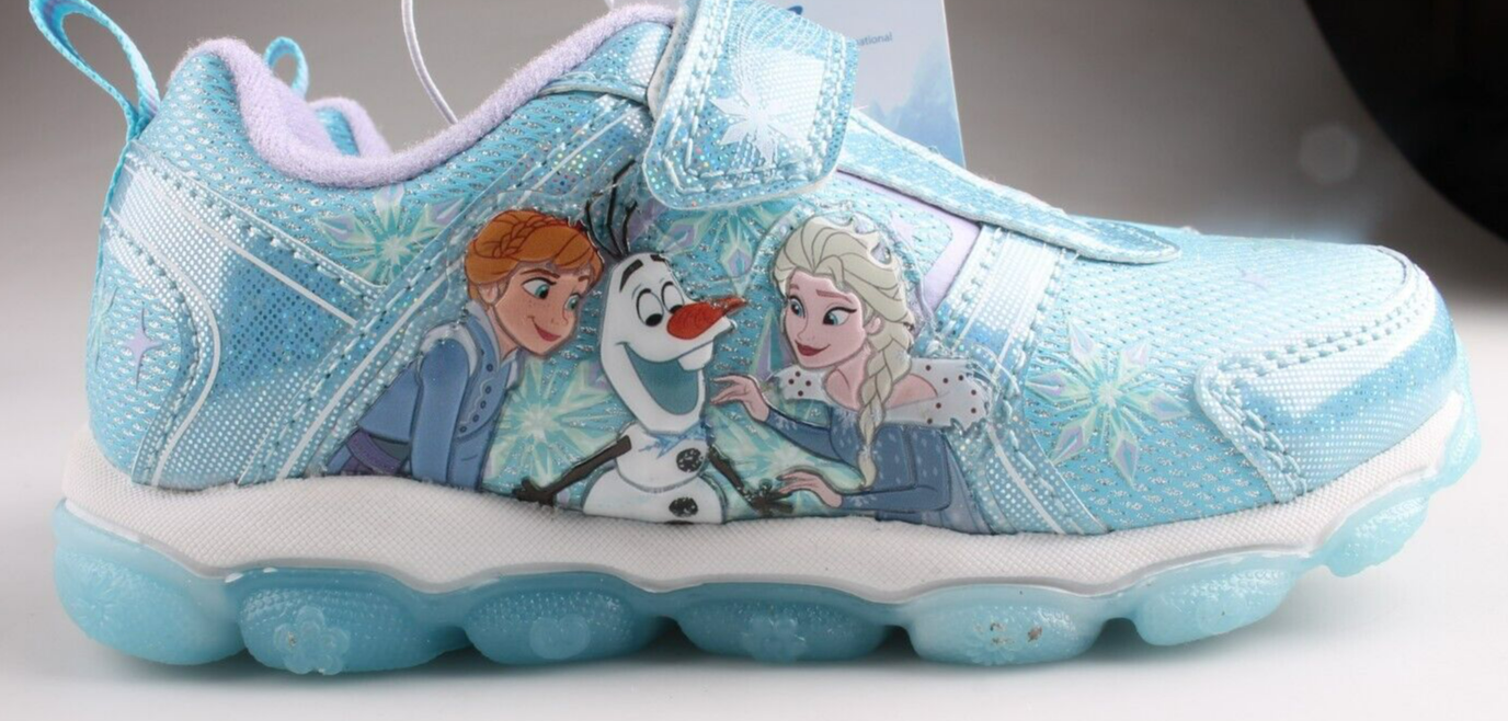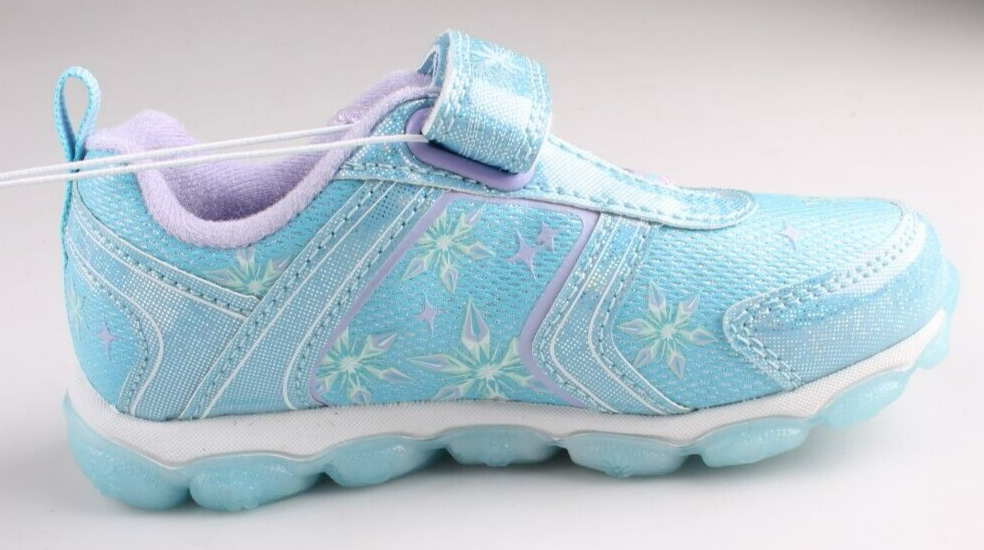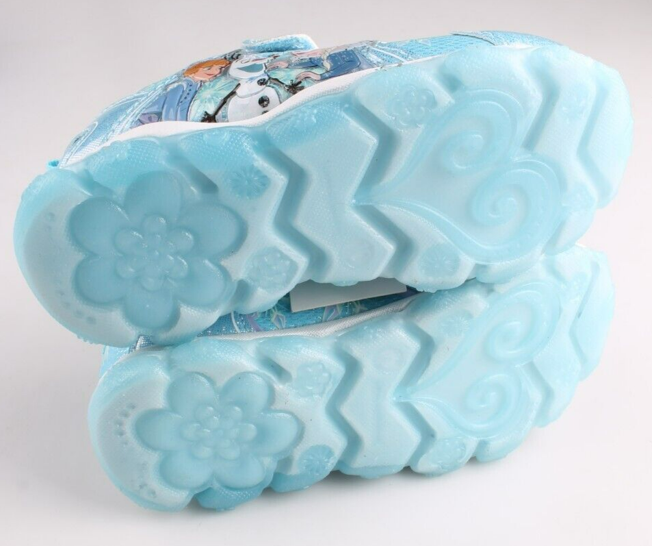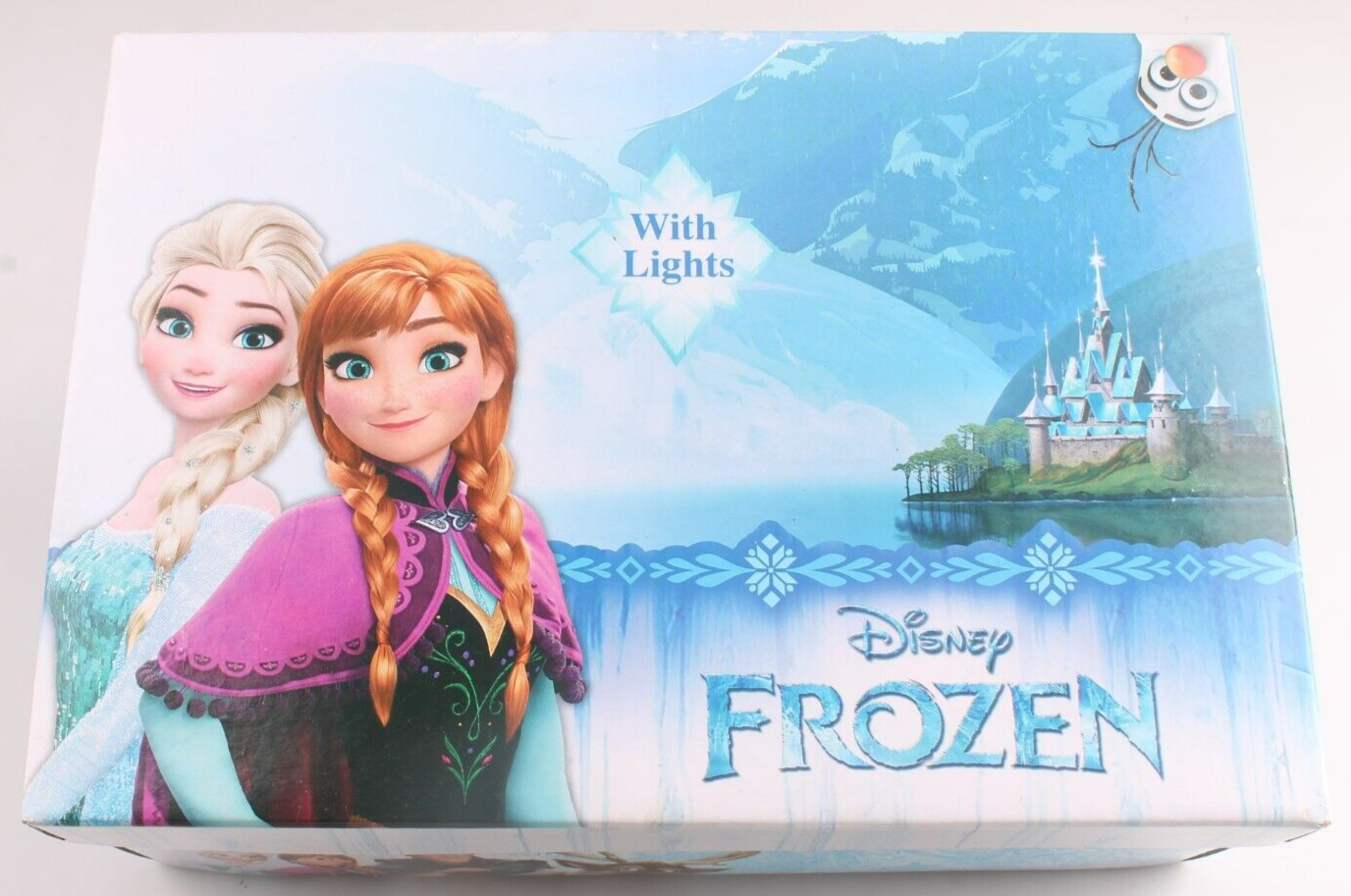 The Disney Frozen Girls Shoe in size 10 is a sparkling blue sneaker with a low top style and closed toe shape. Lights work! Brand New in Original Frozen Box - Deadstock It features Slip-on closure for easy wear, memory foam for comfort, and LED lights for added brightness. The shoe is designed with characters Elsa and Anna from the Frozen movie, making it a perfect accessory for any fan of the film. This athletic shoe is ideal for casual wear or activewear, suitable for all seasons with a synthetic upper material and standard shoe width.