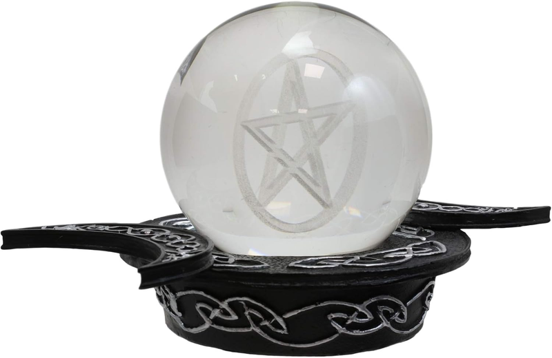 The Triple Goddess represents the feminine, nurturing side of Deity -intuitive, creative, and magical. She is the inner nature of Deity -the origin of the external Universe. This Wicca Decor Set comprises of the Clear Translucent Gazing Glass Ball Orb With A Pentacle Star and the base holder that features the crescent moons symbolizing the Triple Goddess; Mother Maiden and Crone. The point-up pentagram represents the spirit ascending above matter. The top point represents the Element of Spirit, the other four points represent the four Spiritual Elements. It?s a symbol of the Wiccan faith, a symbol of the 5 Elements (one for each point), and the circle (the universe) contains and connects them all.