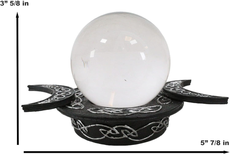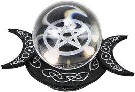 The Triple Goddess represents the feminine, nurturing side of Deity -intuitive, creative, and magical. She is the inner nature of Deity -the origin of the external Universe. This Wicca Decor Set comprises of the Clear Translucent Gazing Glass Ball Orb With A Pentacle Star and the base holder that features the crescent moons symbolizing the Triple Goddess; Mother Maiden and Crone.