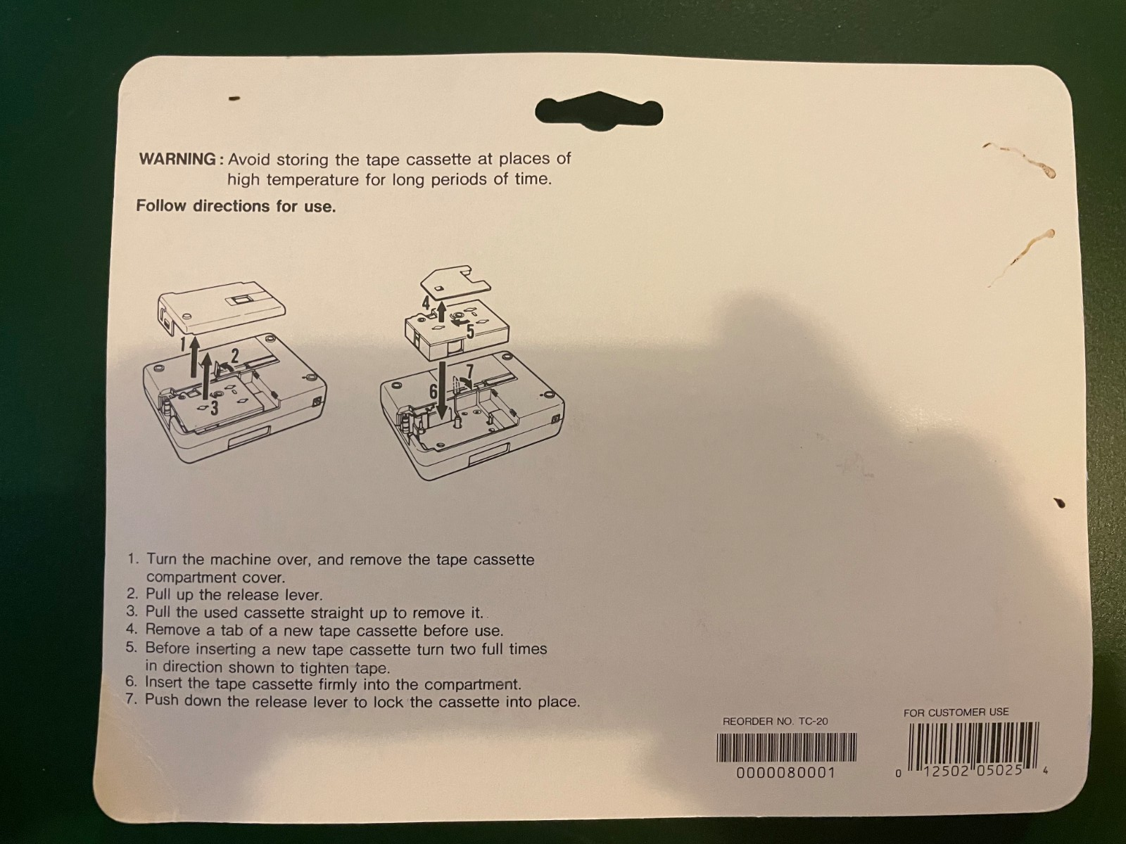 Brother TC-20 Black on White Tape 1/2" P-touch 12mm New tape cassette