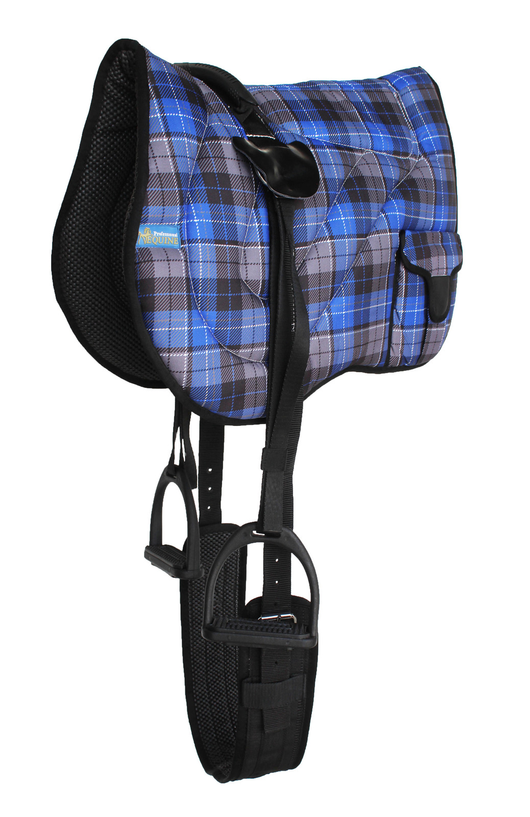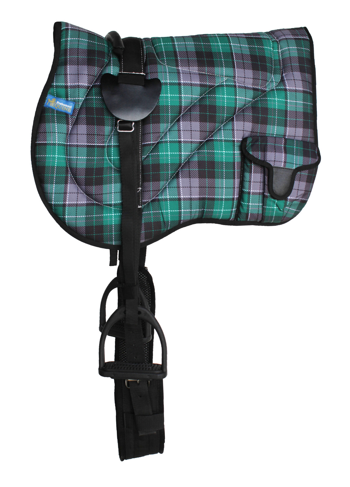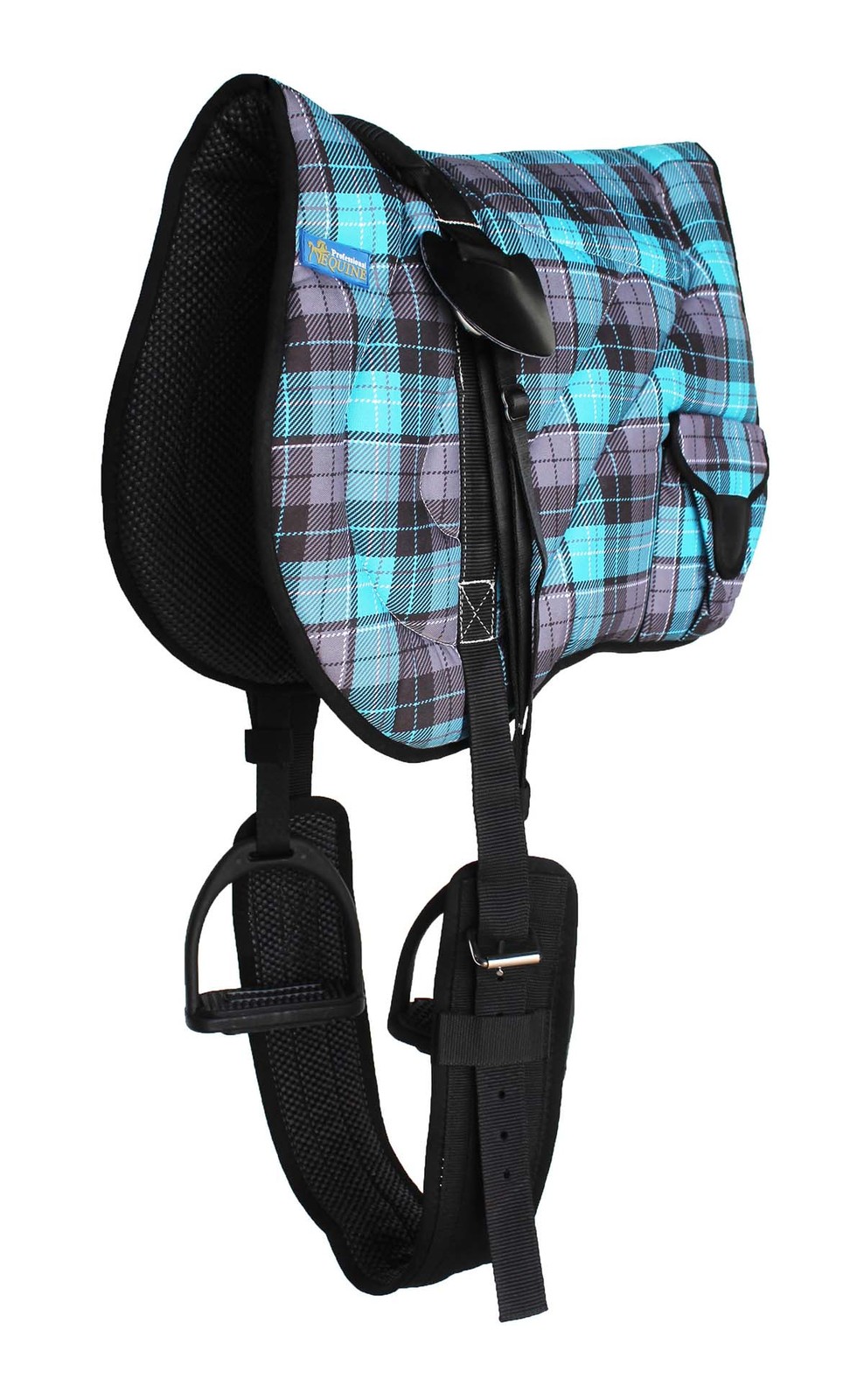 This Professional Equine lightweight bareback pad features a unique plaid pattern upper. Inside the pad is lightweight, superior cushion support for maximum comfort. Contoured design shapes to the horse's back for wither relief. Neoprene bottom helps prevent slippage while promoting air circulation to wick away and dissipate sweat from the horse's back. Rear Velcro closure bags to carry all necessities while on a trail ride. Removable cinch included measures 32" L x 3" W. Pad measures 21.5" L x 41.5" W. Stirrups included measure 4 3/4" wide.