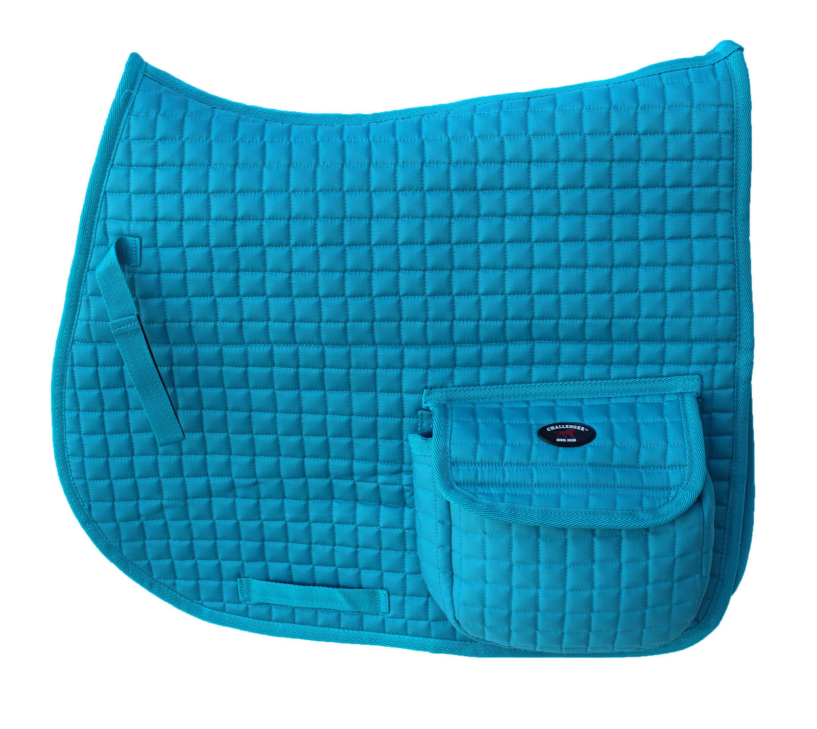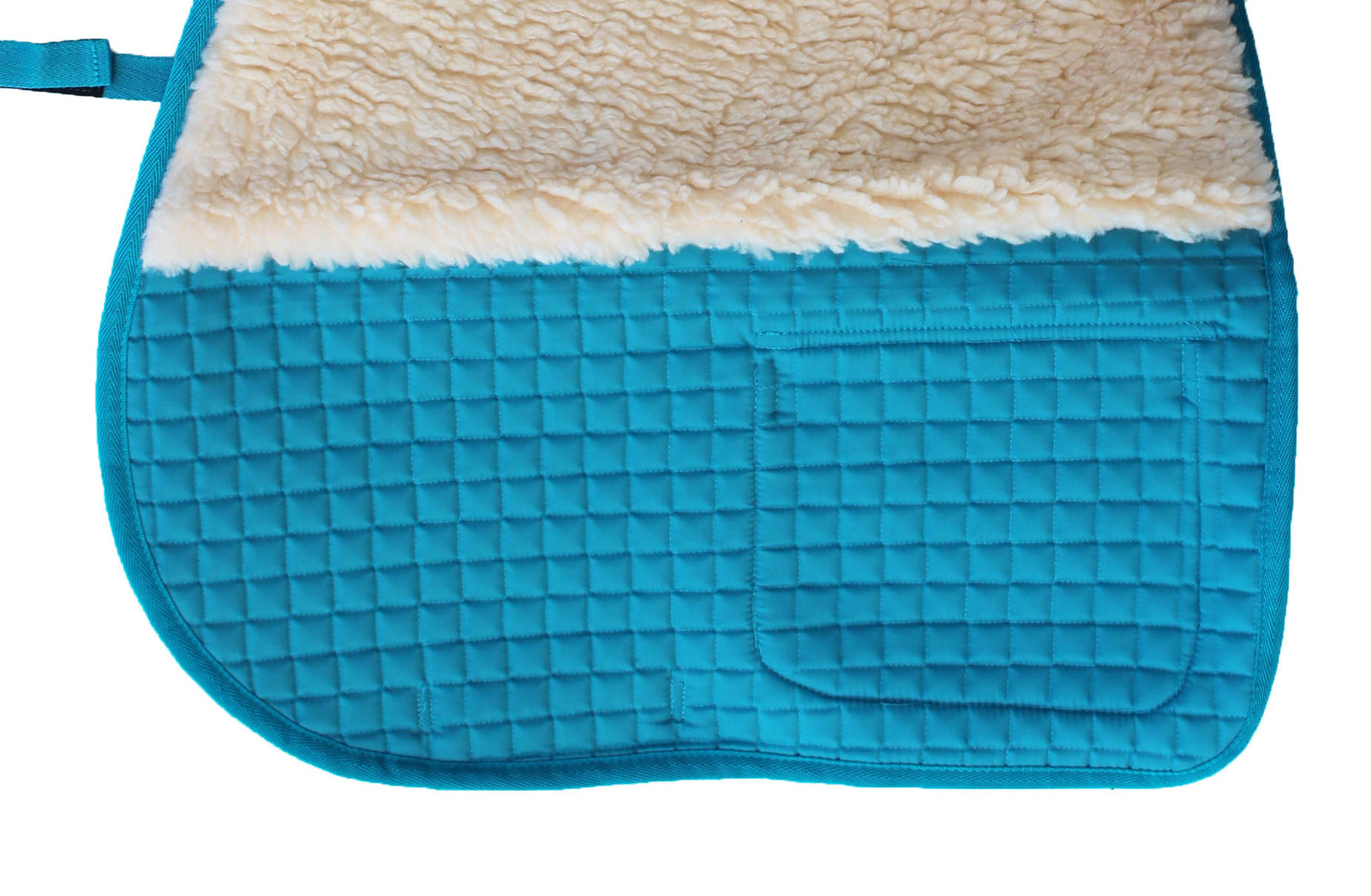 Classic all-purpose wither relief cut pad with a moisture wicking quilted pattern. Features a faux fur underside for comfort. Pockets have a Velcro closure to ensure all belongings are secure and easily accessible. Nylon girth/ billet straps. Measurement : Spine 23" x Drop 22"