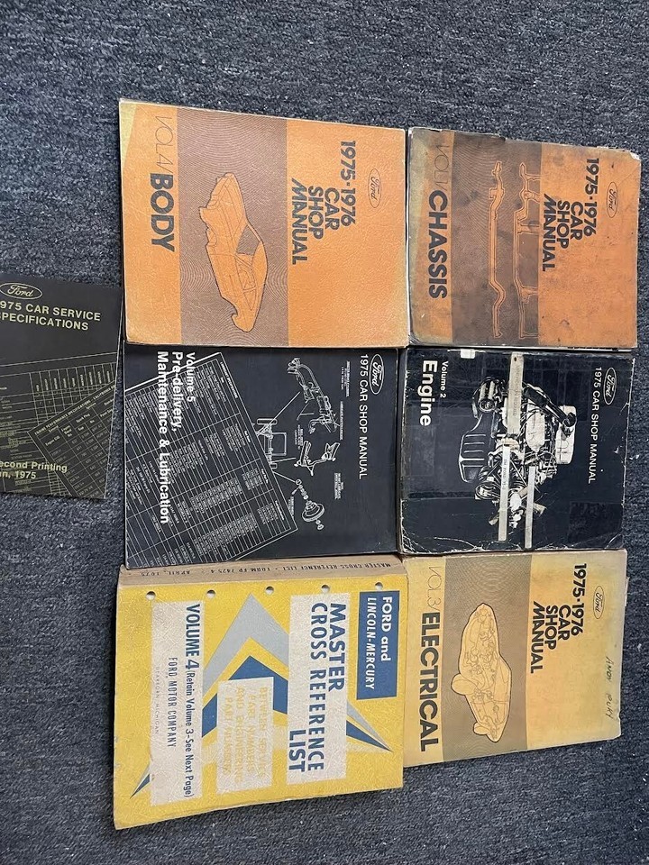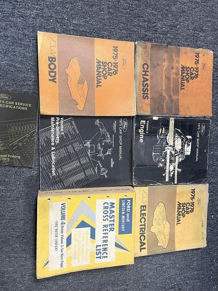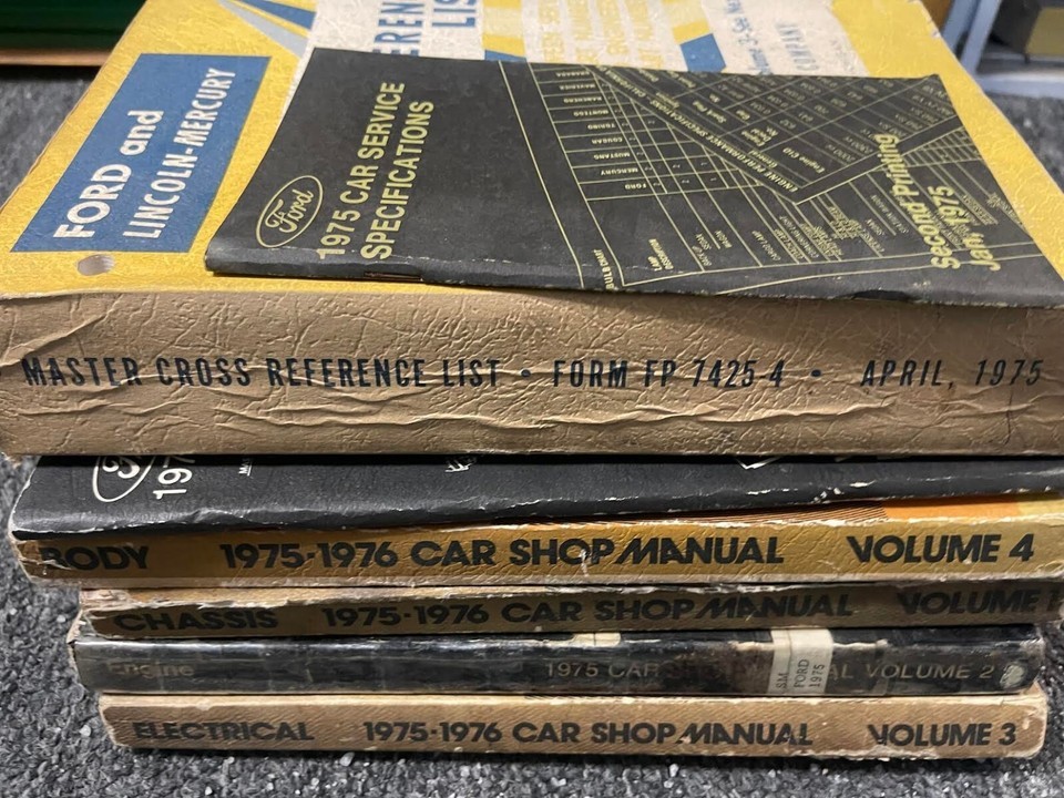 Factory 1975-1976 Ford/Lincoln/MERCURY CAR MODELS Service Manual 5 Volume Set, Master Cross Reference Book, Specifications Booklet