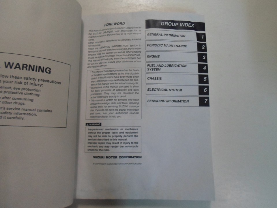 exploded illustrations and/or diagrams, great manual to have when you own a SUZUKI DR-Z125/L and it will keep your motorcycle on the road. This manual will save you money in Repairs/Service.