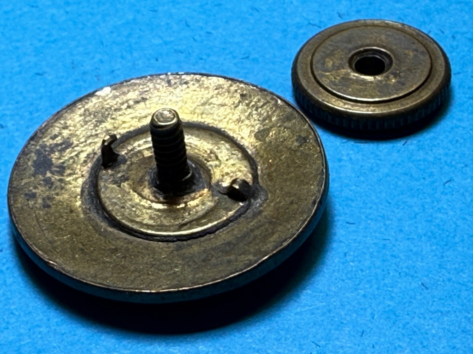 The thumb screw is intact. Measures approx. one inch in diameter. Screw back. Vaulted.