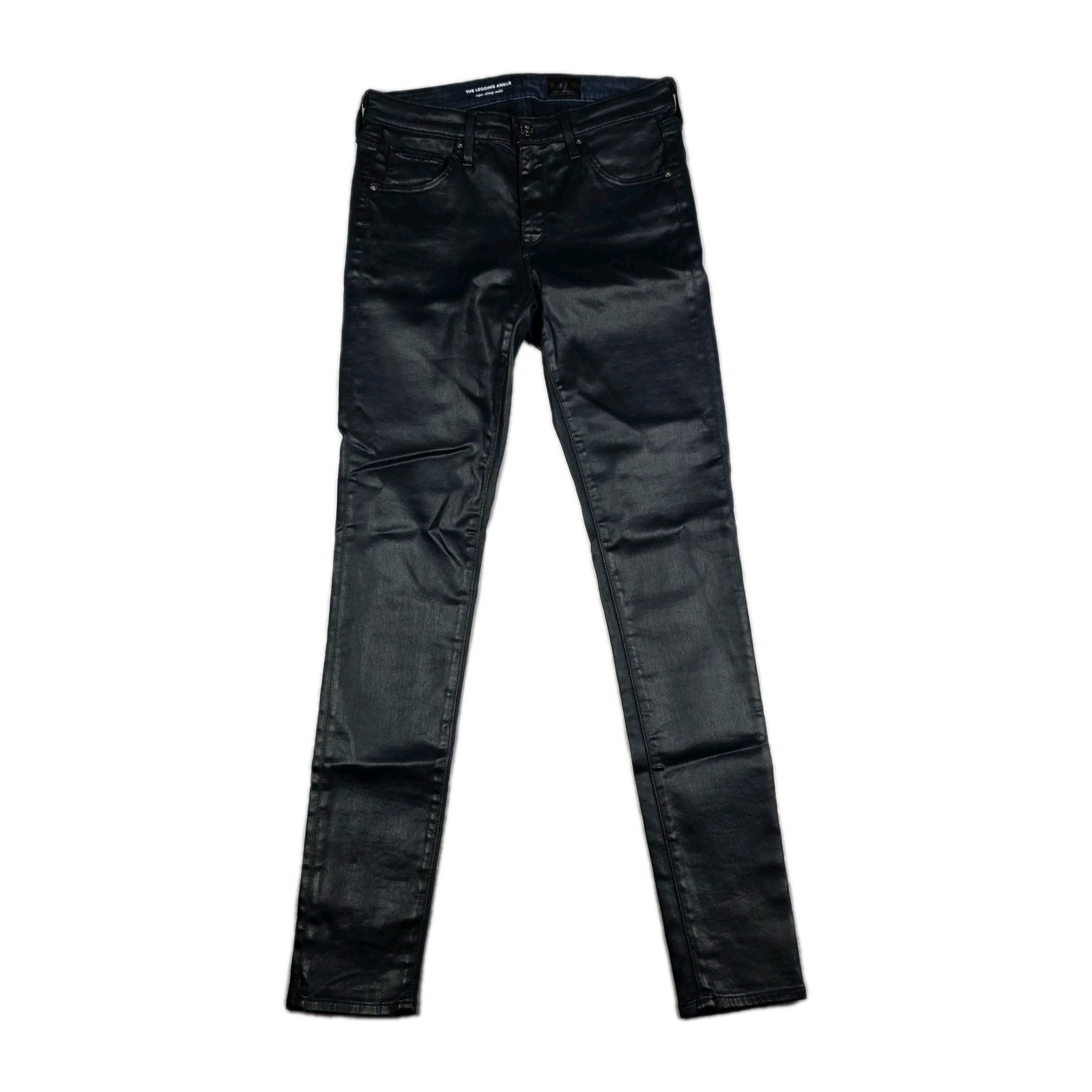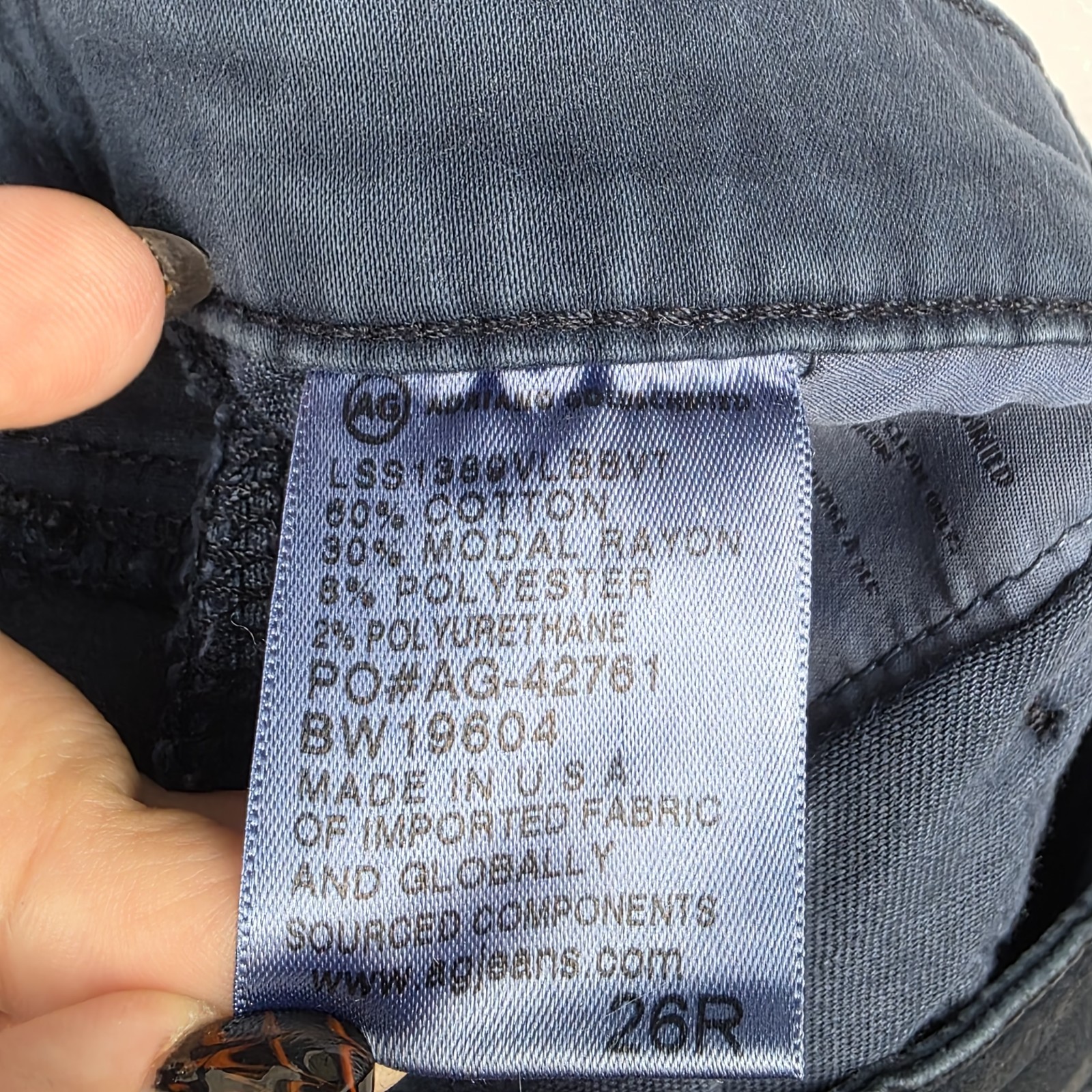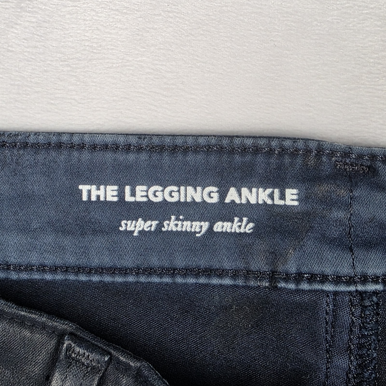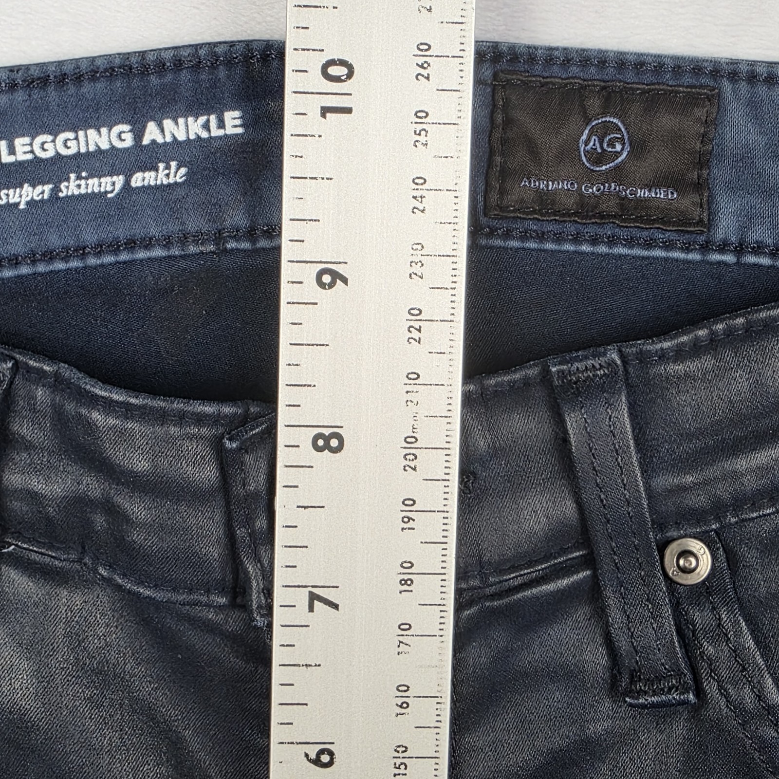 The product is a pair of Adriano Goldschmied Women's Jeans in a size 26R, popular style The Legging Ankle Super Skinny in Blue color. These jeans feature a low rise, zip and button closure, and are made of 100% cotton denim fabric. The design includes a 5-pocket design with a coin pocket, and the inseam is 29 inches. The AG Adriano Goldschmied brand is known for its quality and stylish line of women's jeans, making this pair a versatile and trendy addition to any wardrobe.