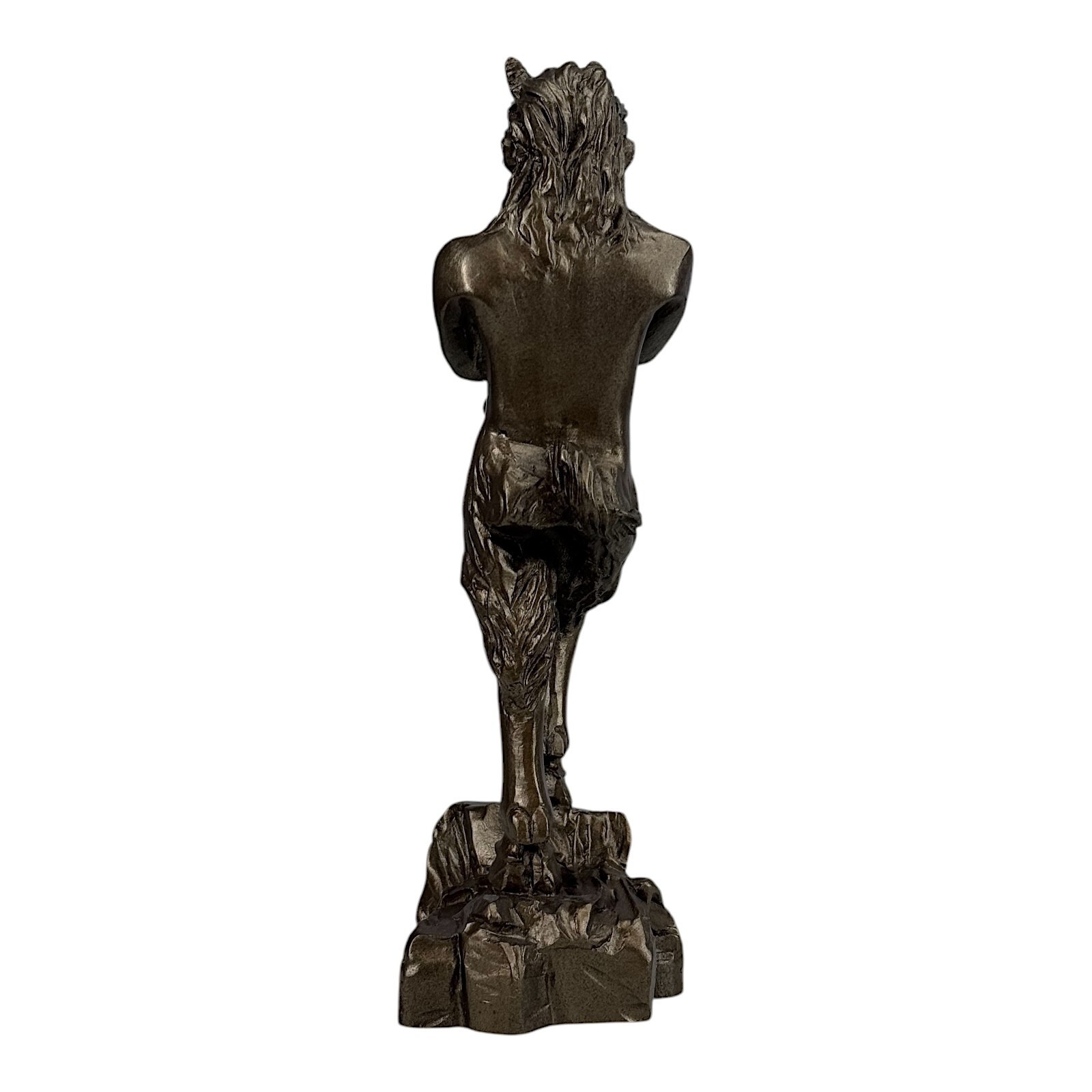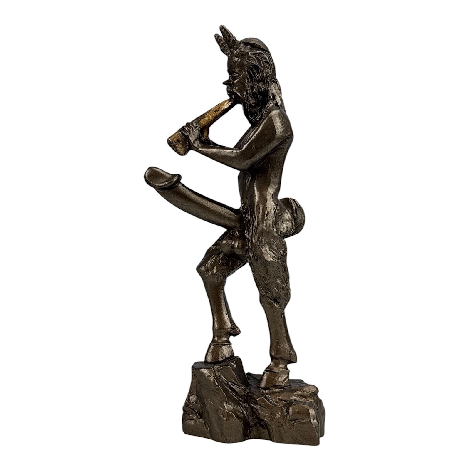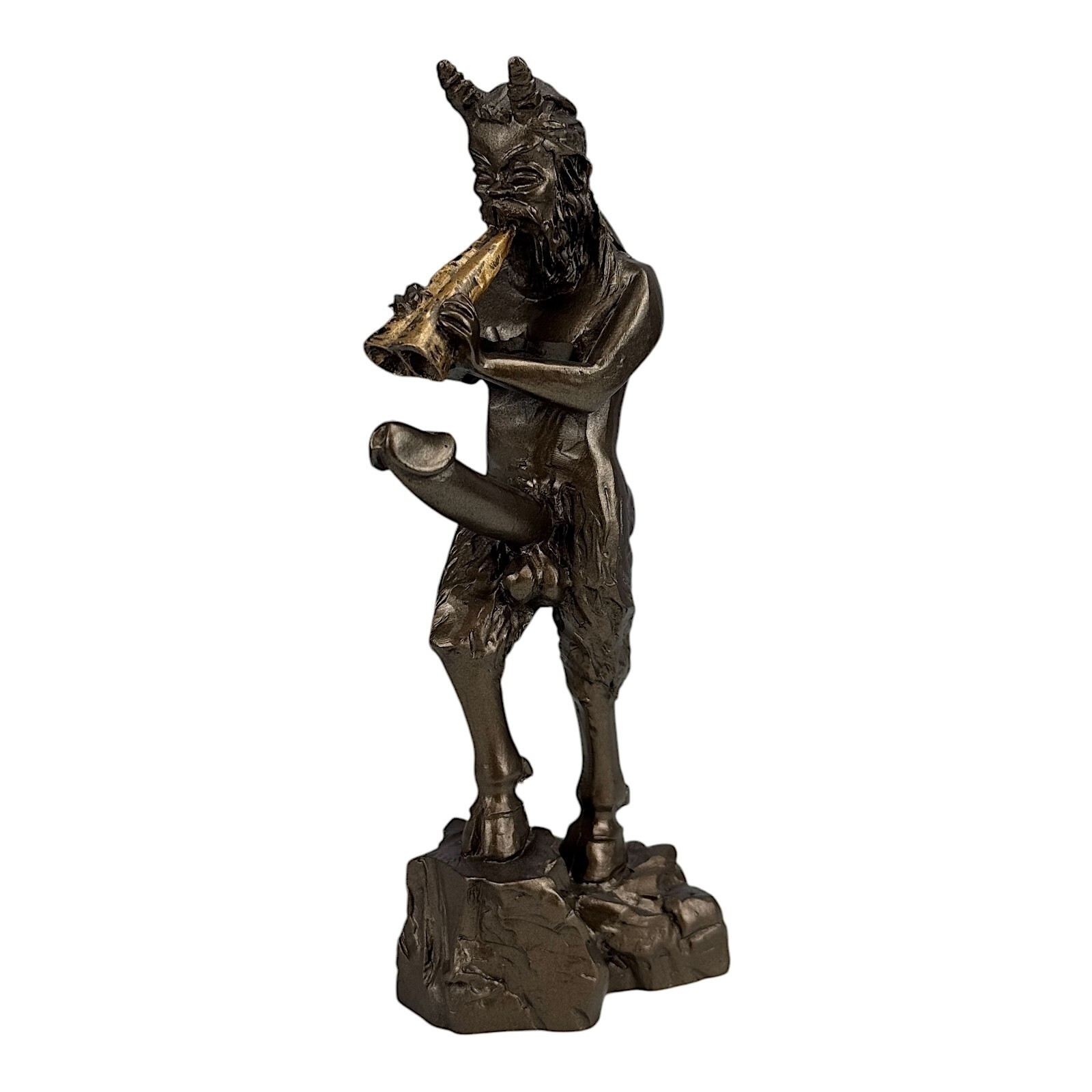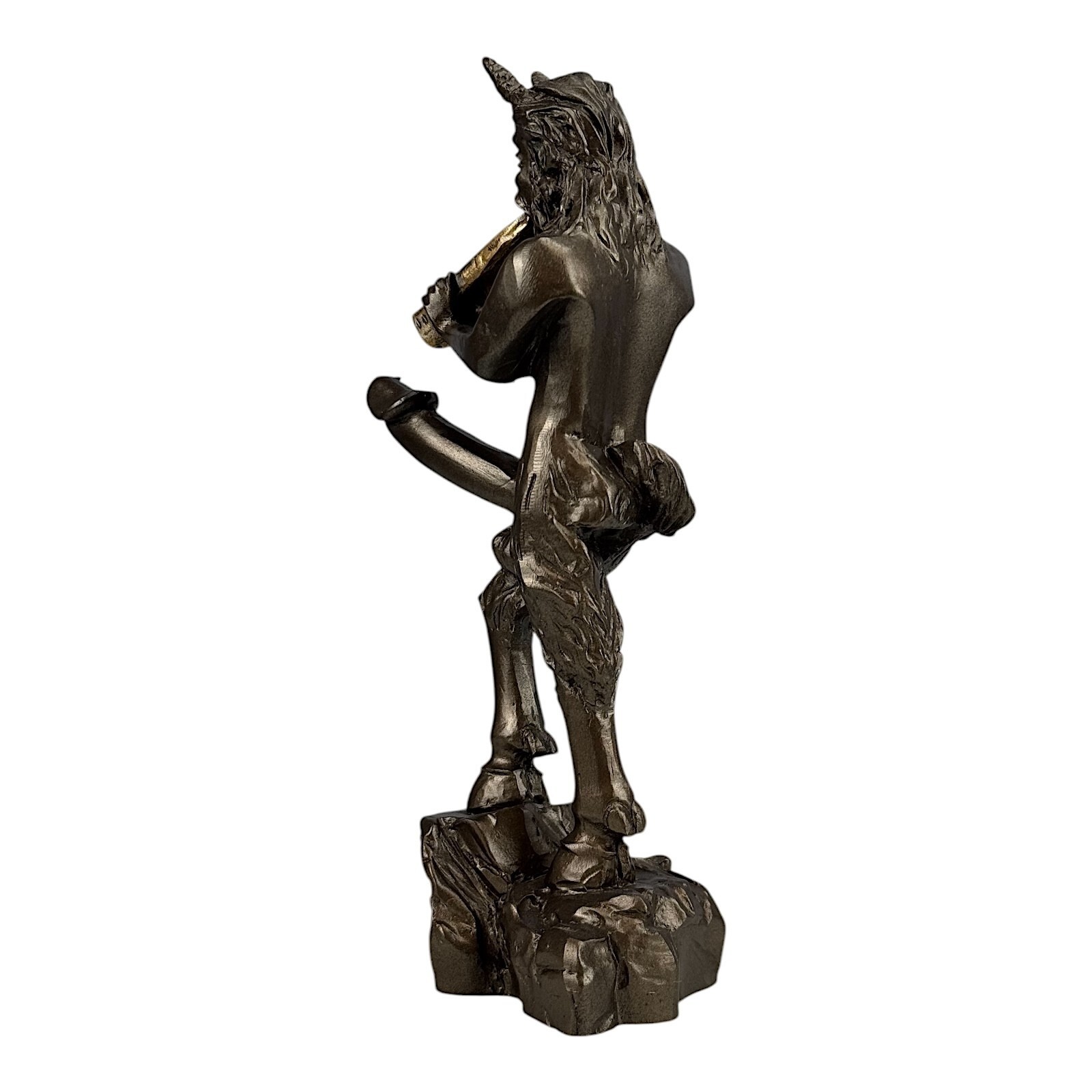 bronze-colored sculpture depicts Pan in a tasteful nude form, complete with his