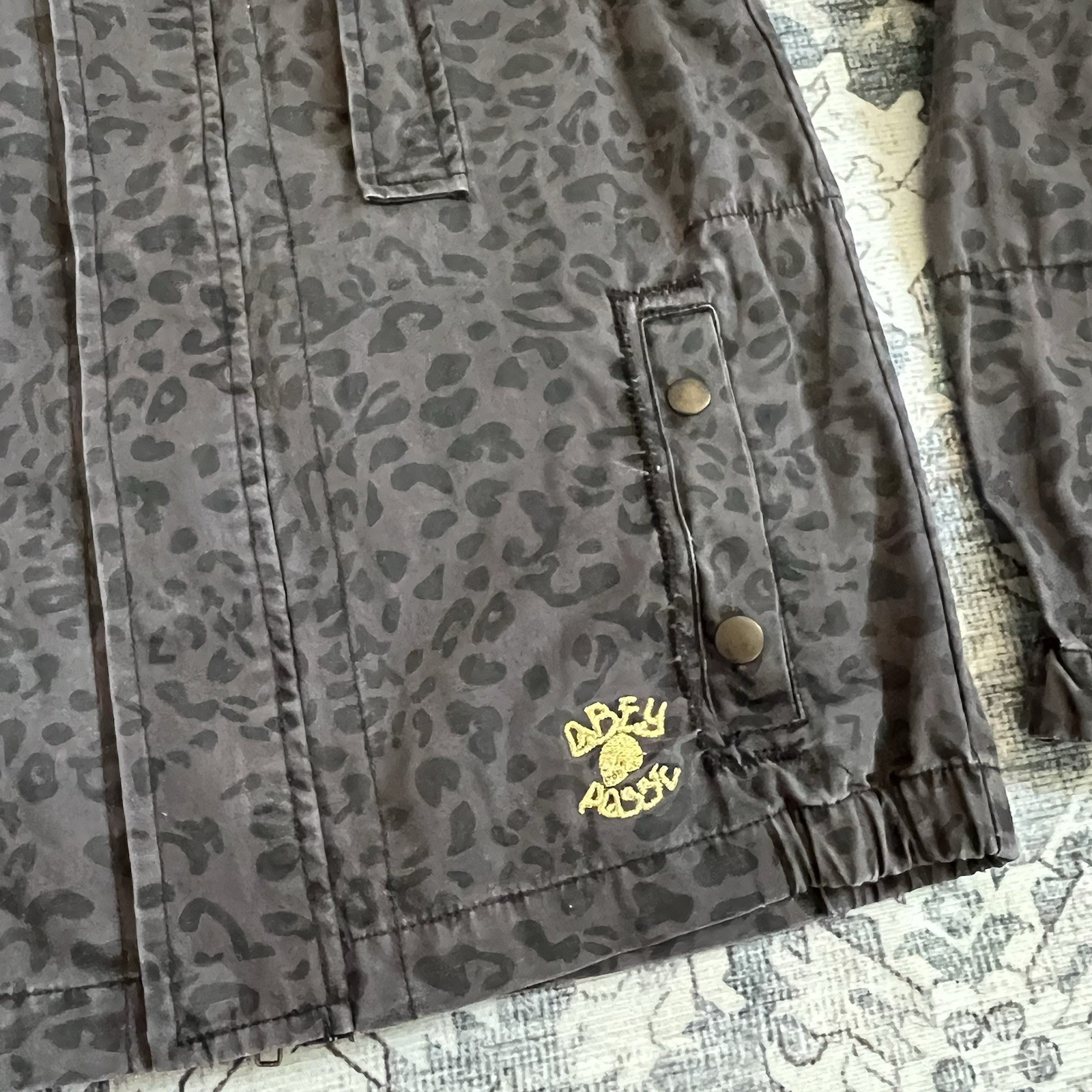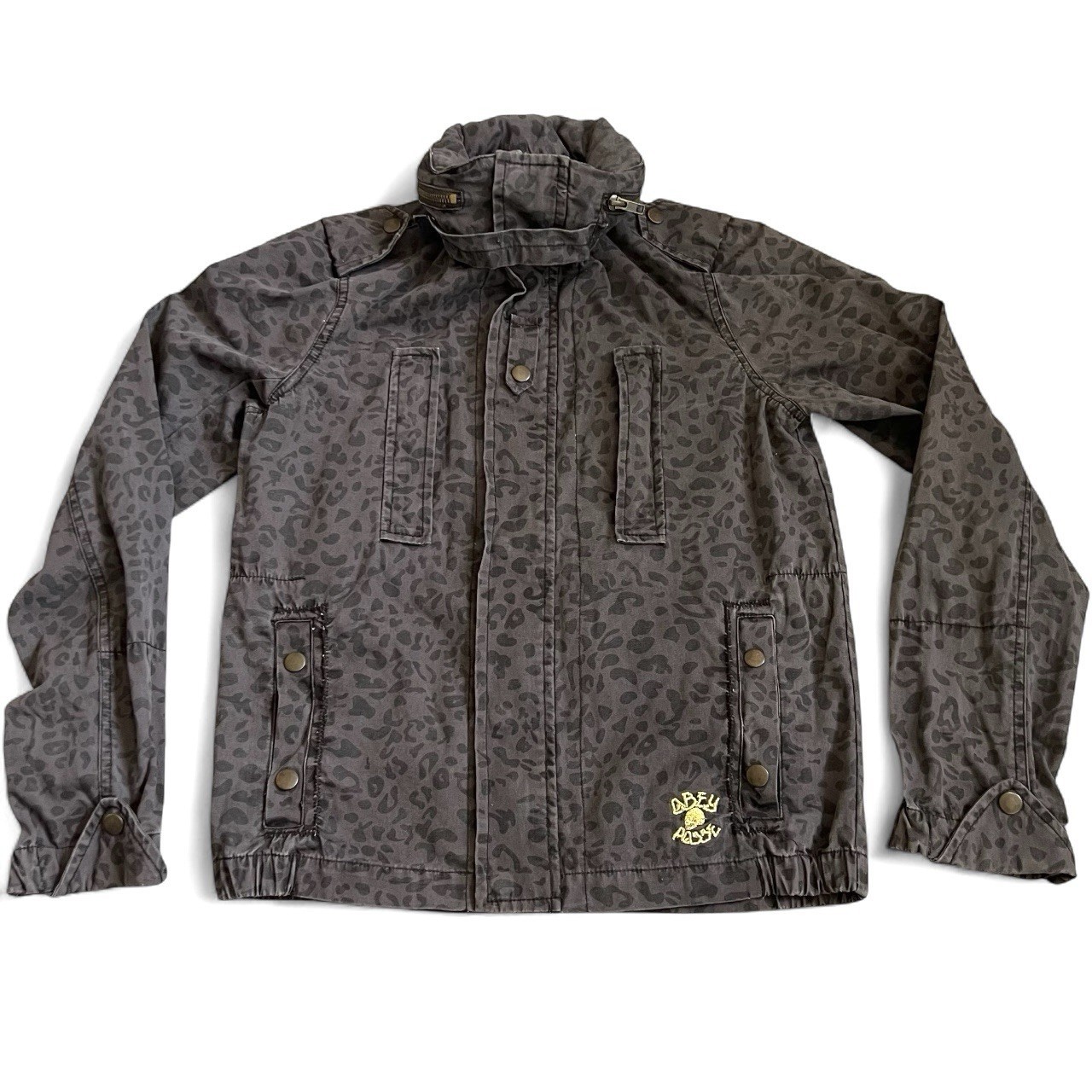 Obey Women’s Cheetah Leopard Print Military Jacket W/ Hood Sz S Grey Black Spots
