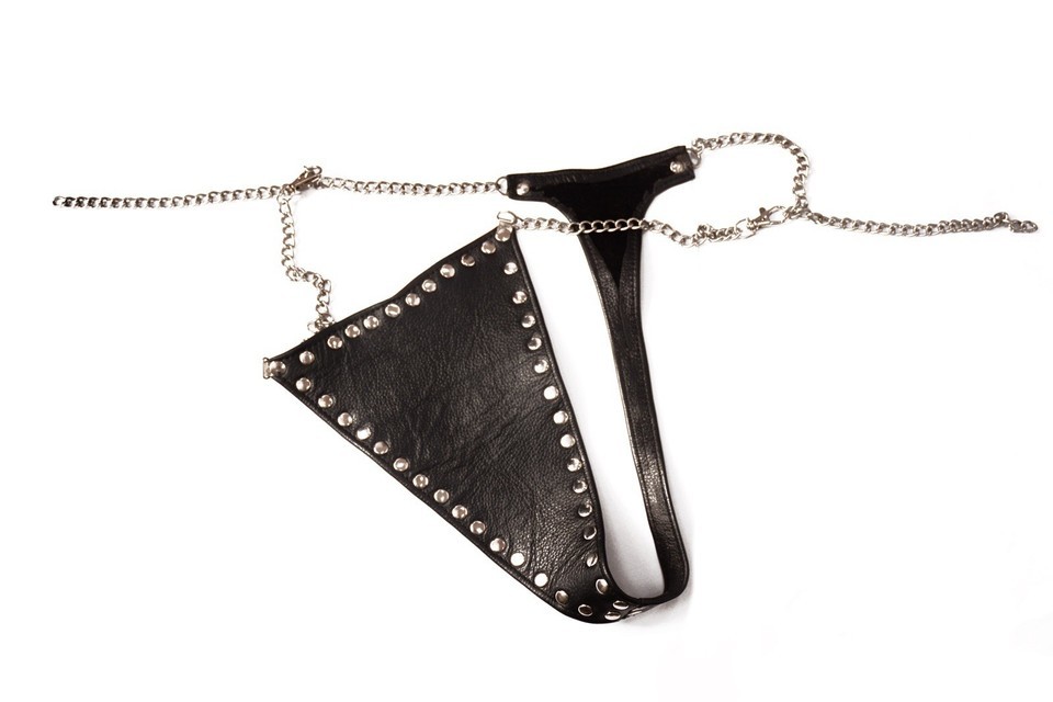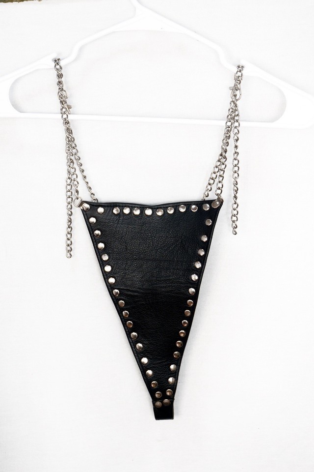 Handmade sexy leather thong with a leather piece connected by chains. We have a Silver and Black Color.