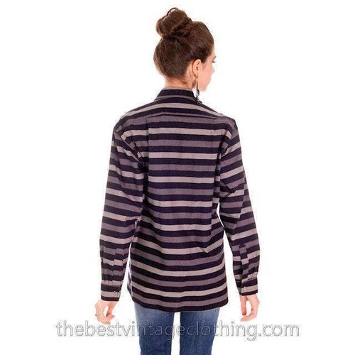 Vintage 1970s Vuokko jacket/top, crafted in substantial cotton with horizontal black, gray, and charcoal stripes. Designed in a versatile straight cut with menswear styling, featuring a snap front and one patch pocket. Can be worn as a lightweight jacket or as a top on its own ? a classic Vuokko piece that balances utility with timeless style.