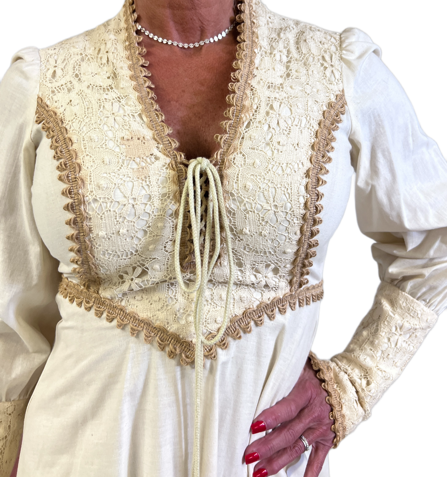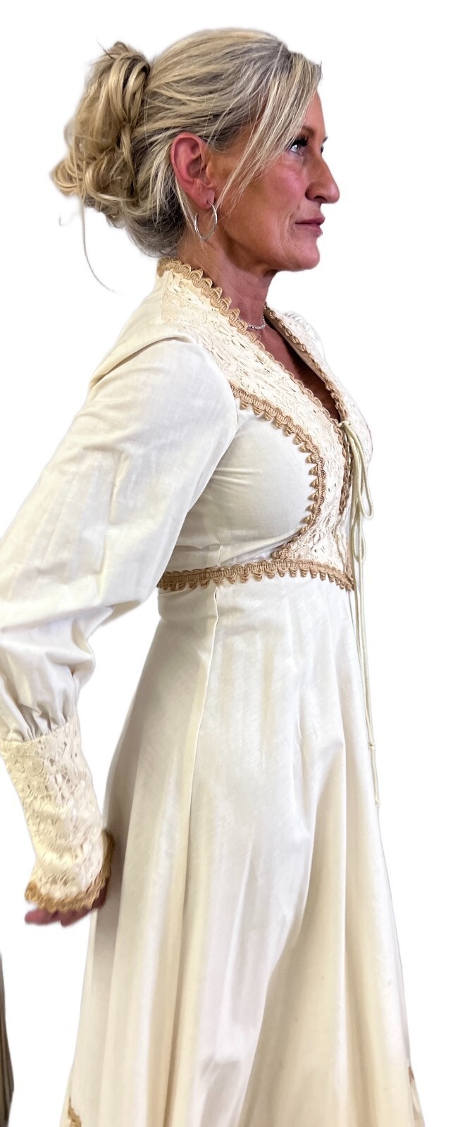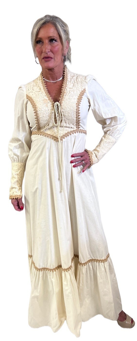 VTG 70s Prairie Maxi Wedding Dress Boho Cottagecore Queen Anne Neckline XS 32B