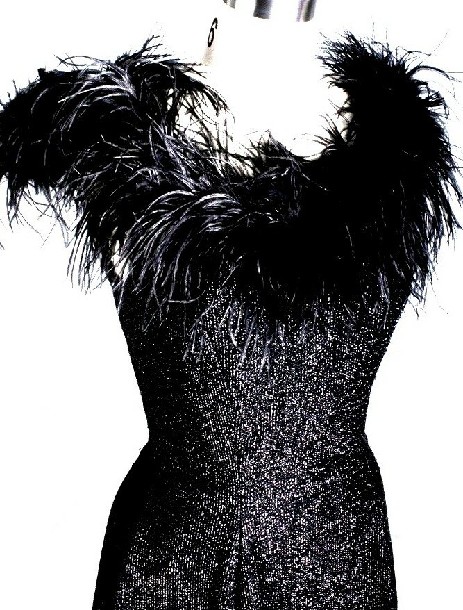 Fabric / Materials: Lurex with broken-strand sparkle effect; ostrich feather neckline trim; fully lined.