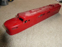 You are bidding on a nice looking, MTH O Gauge, unused sample locomotive body or shell, undecorated red, in the pictures. 16 inches long. Unused factory sample with some writing on the inside, light scratches, no trim and comes as shown. Zoom in for details.