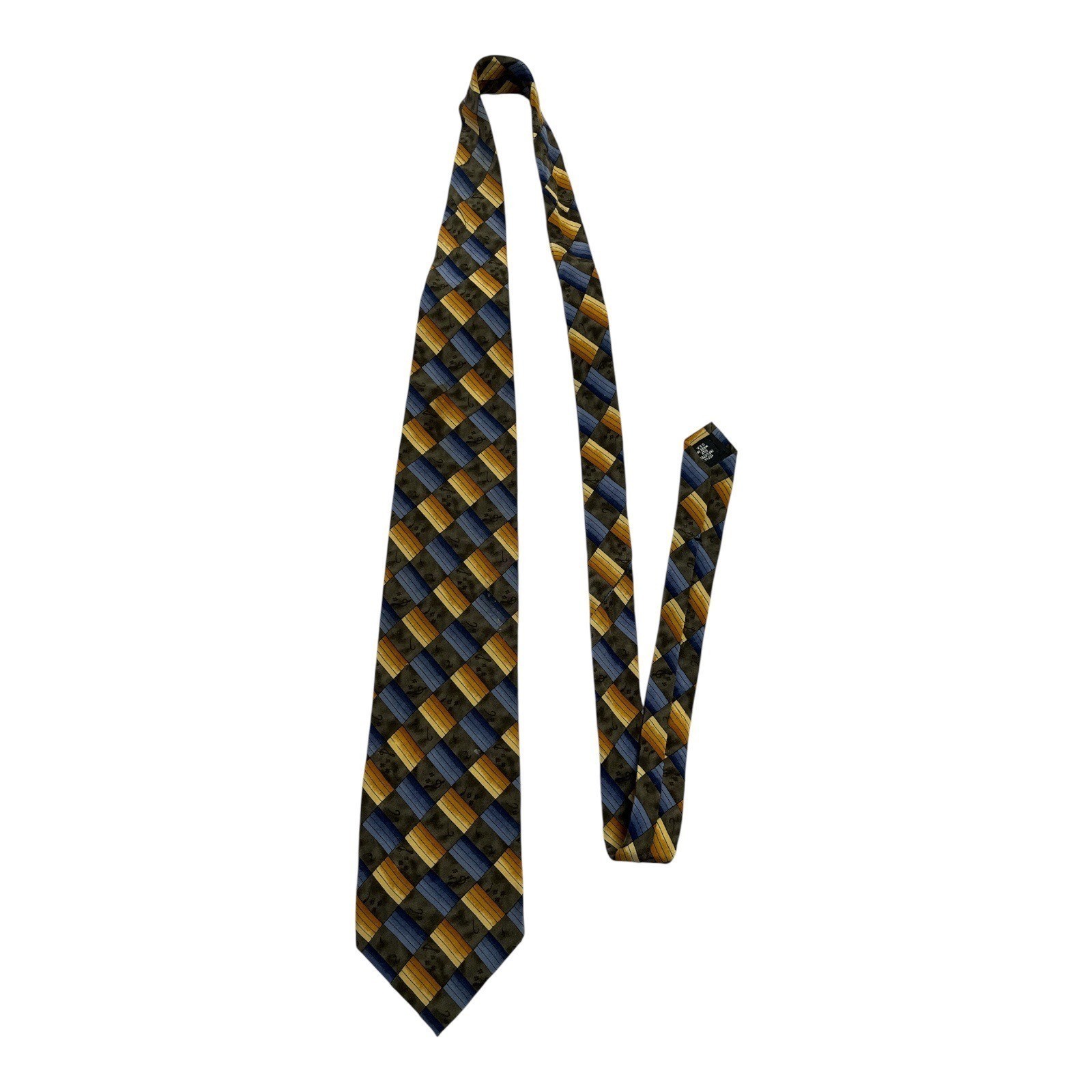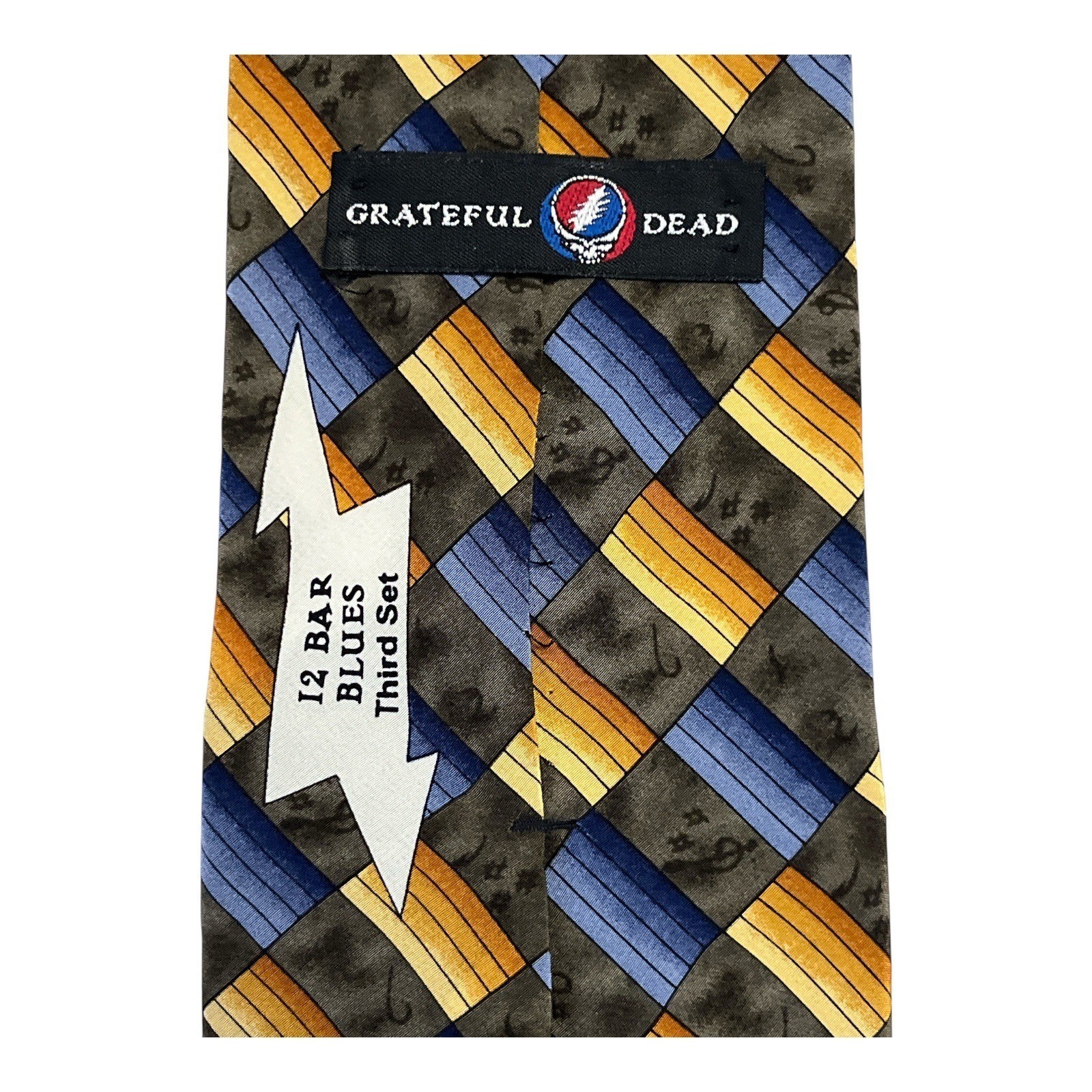 Vibrant and collectible Grateful Dead men?s necktie titled *?12 Bar Blues ? Third Set.?* Features a colorful geometric pattern in blue, gold, and brown tones with subtle musical note accents. Crafted from 100% imported silk and made in the USA, this tie combines bold style with rock-and-roll nostalgia?perfect for fans, collectors, or formal wear with personality.
