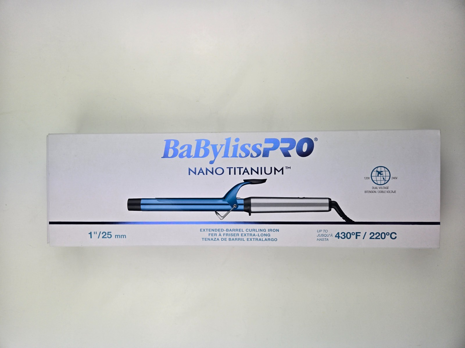 This curling iron features an Extended Barrel that's 2" longer than traditional curling barrels, made of ultra lightweight Nano Titanium for even heat distribution and retention. Digital temperature control up to 430F.Dual Voltage for Worldwide Use