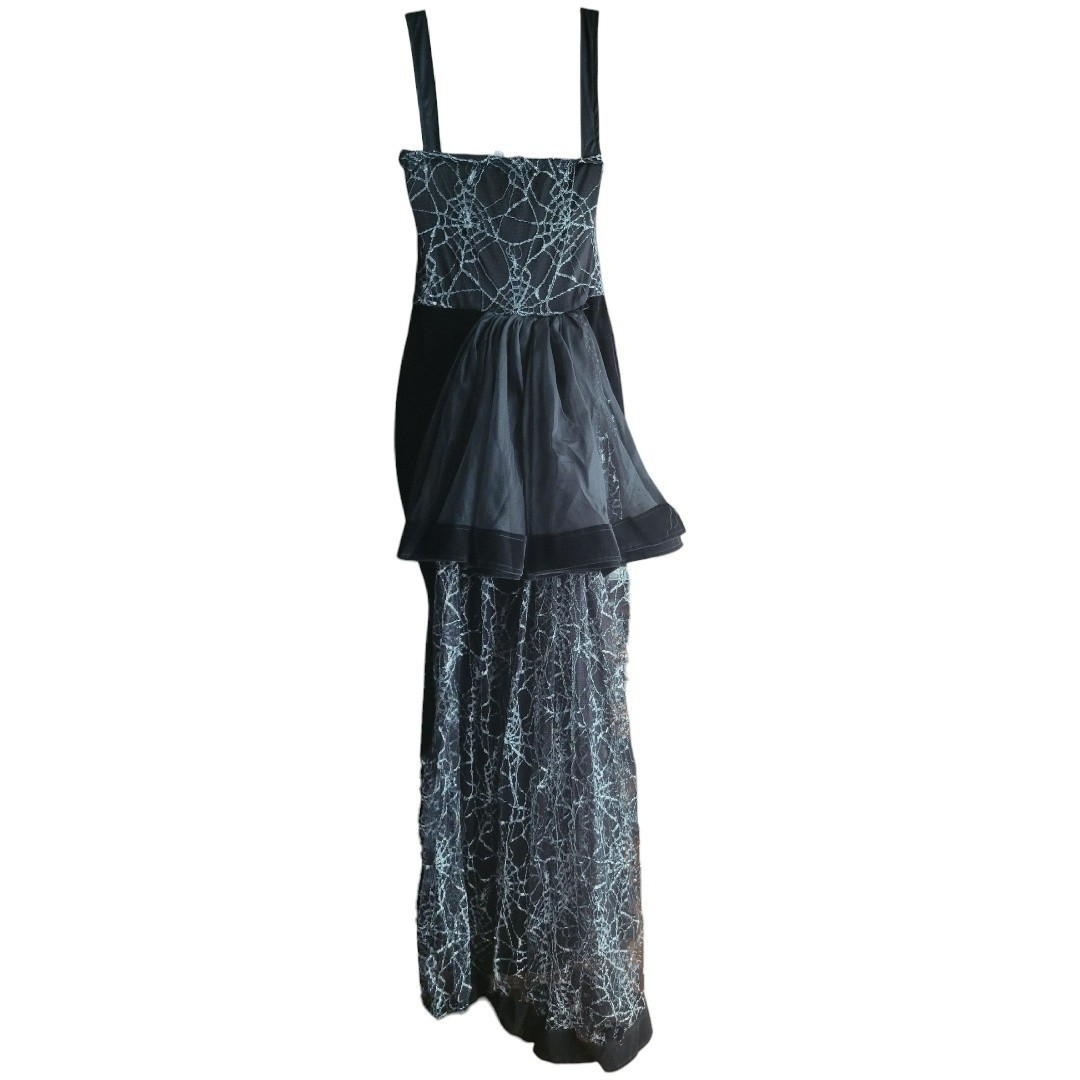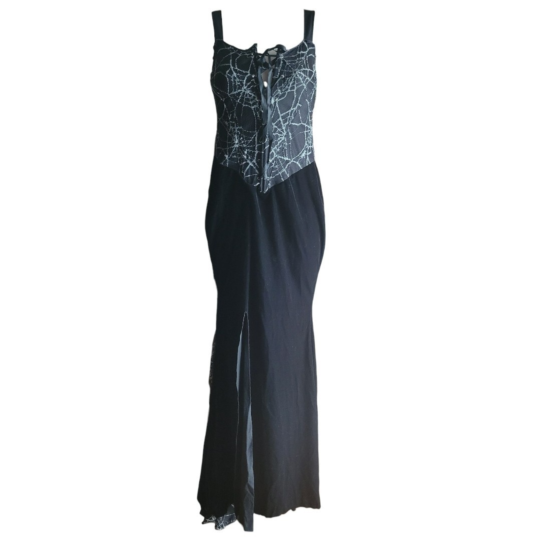 2pc Black Widow Spider costume includes dress, long tiered train, and headpiece. Velvet bustier gown features unique spider web embroidery. Headpiece features black feathers and lace veil. DOES NOT INCLUDE GLOVES OR CHOKER. Ships in original plain bag. This costume was never worn because it was small and didn't fit. It has a slight stretch, and the lace-up bustier is adjustable.