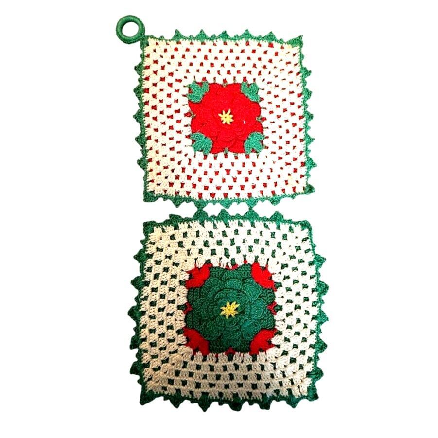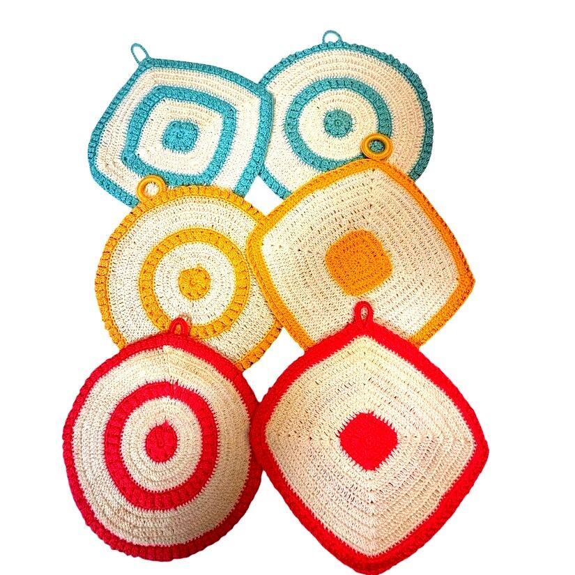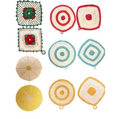 11 1940s Kitschy Kitchen Crocheted potholders app 7" sq. They are all in excellent condition, with no stains; they seem to have been just used as decorations. 2 are like lemon slices, pretty!
