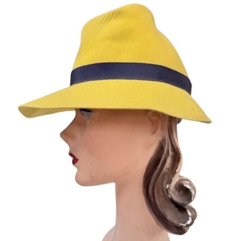 This sunshine-yellow wool felt fedora by Gaby's Exclusive Shoppe channels pure 1940s wartime elegance. With a sharply angled brim, tall structured crown, stitched detailing, and a sleek navy blue grosgrain ribbon band, it evokes the glamour of classic film noir and Casablanca-era fashion. A rare deadstock piece in a bold statement hue ? perfect for collectors, stylists, or vintage lovers.