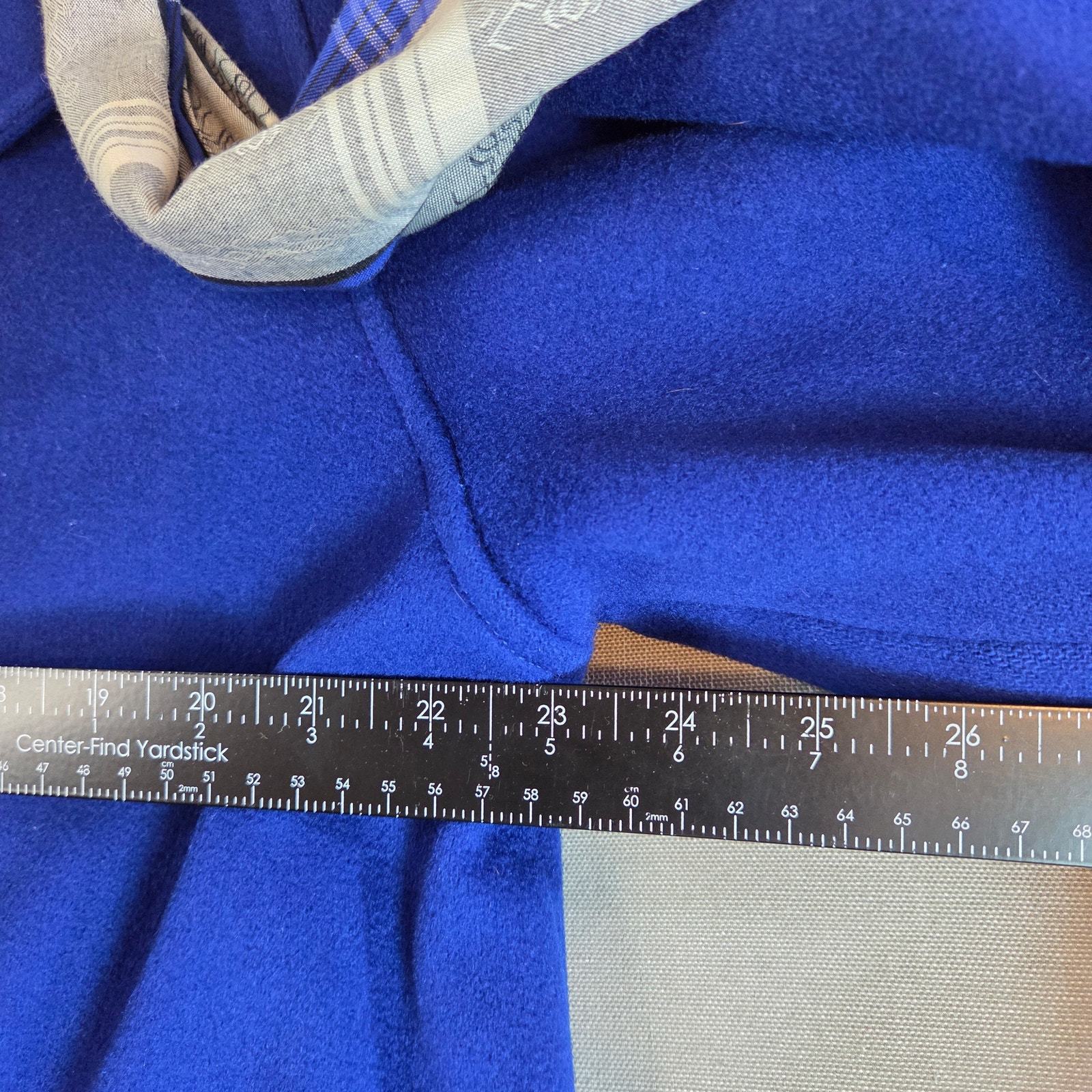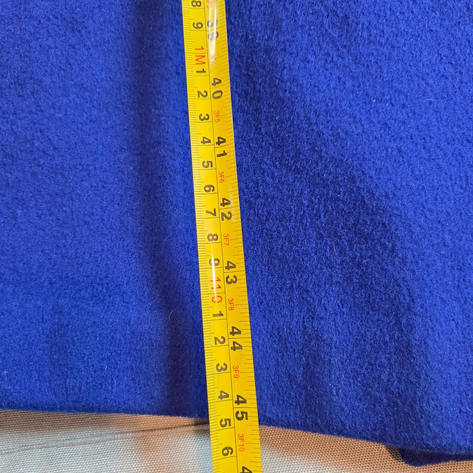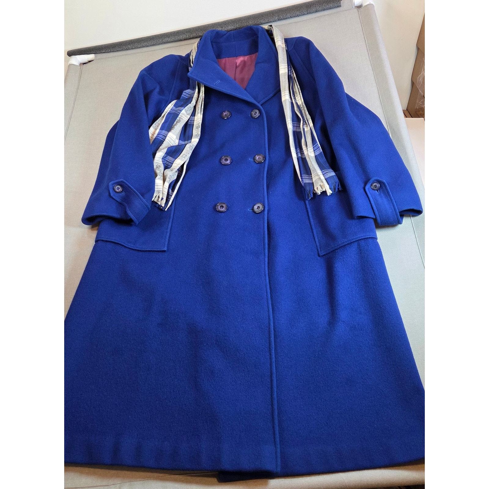 Elegant vintage Jacob-Crowley wool overcoat, made in Canada from pure virgin wool with a luxurious satin lining. Features a bold royal blue color, wide lapels, and double-breasted peacoat styling. Comes with the included plaid scarf.