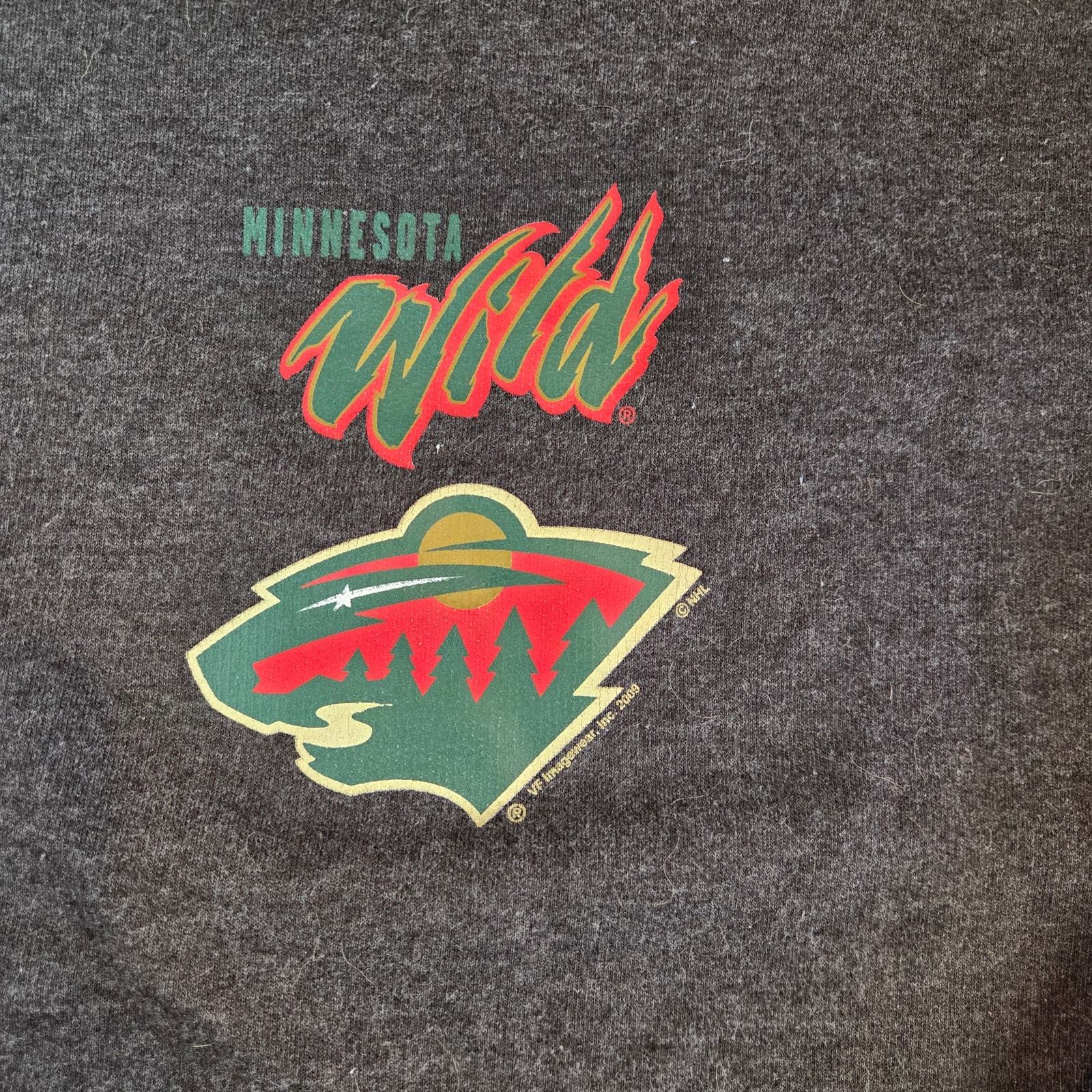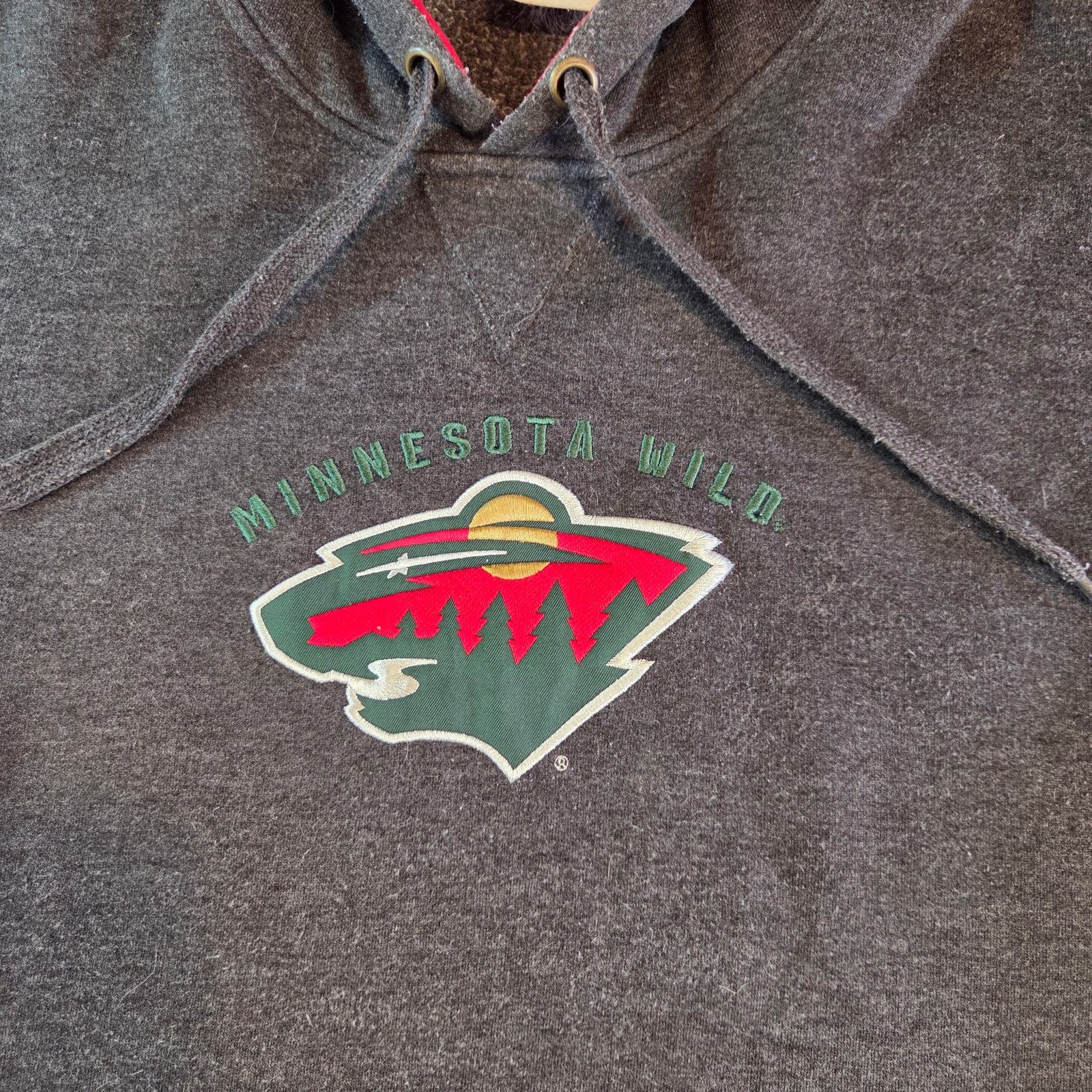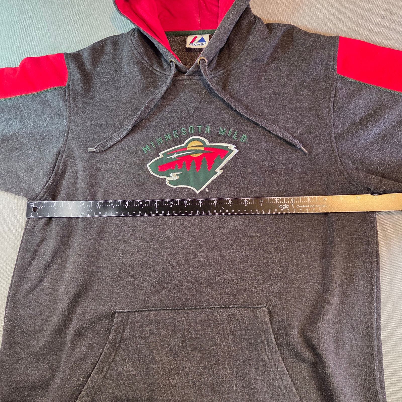 Majestic Minnesota Wild hoodie featuring team logo on the chest and sleeve script detailing. Classic gray and red colorway with a 2009-dated logo graphic. The original size tag is missing, but based on measurements it fits like a Men?s XL (see below for exact sizing). Overall good condition with no noticeable flaws.