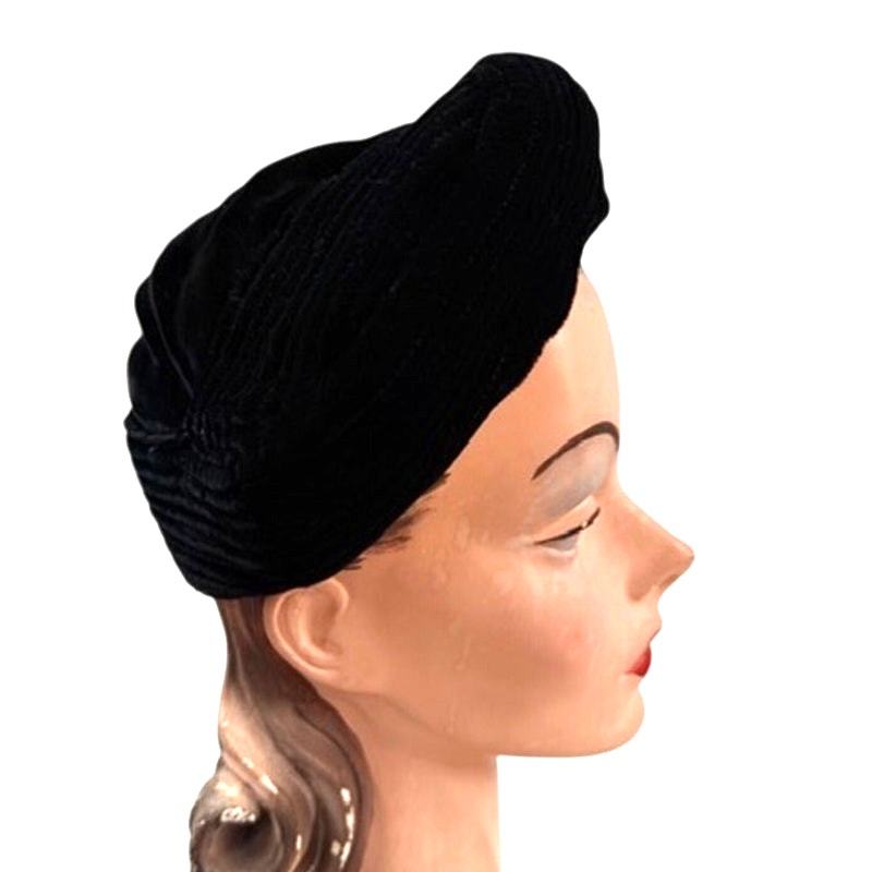 Likely late 1940s?1950s. Black velvet turbans were iconic in postwar women?s millinery ? often paired with suits, evening dresses, and opera coats. Unlabeled but well-constructed, with interior structure typical of quality department store or boutique millinery of the period.